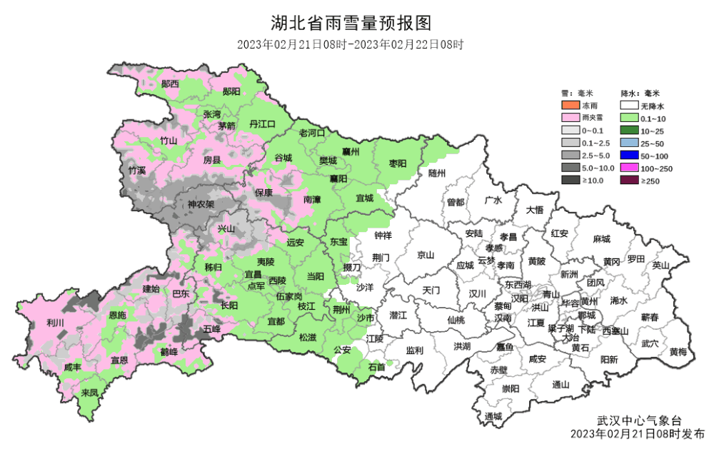 鄂西北西部小雨雪转阴天;鄂西南阴天有小雨,高海拔地区有雨夹雪或雪;其他地区阴天有短时小雨。