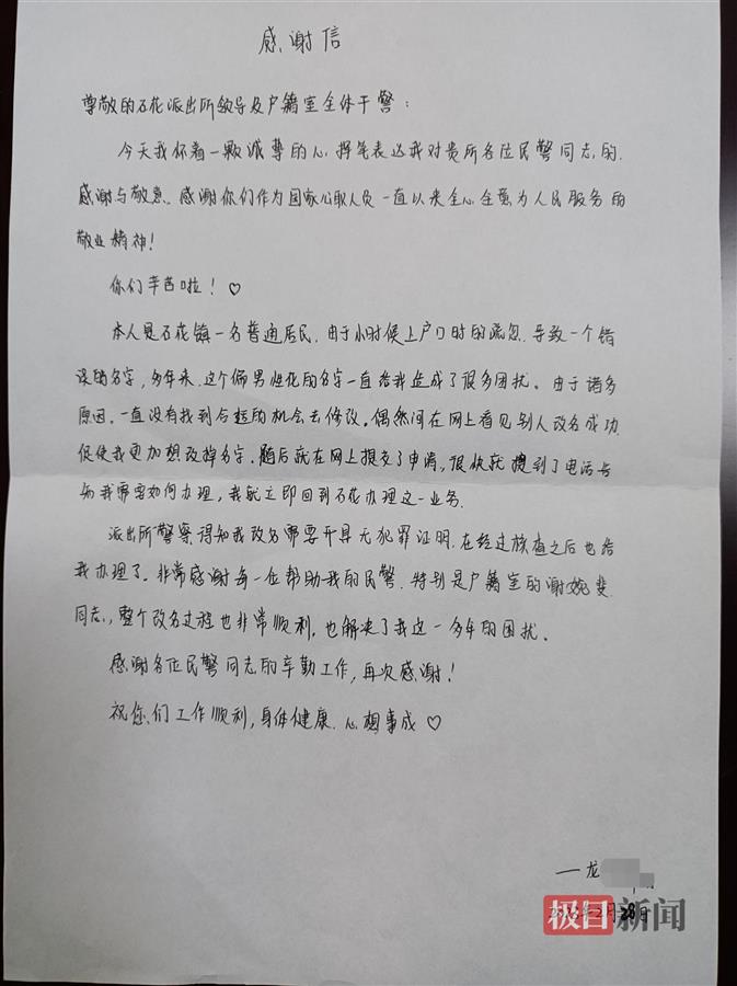 经过为期半个多月的一系列流程办理,2月10日谢婉斐终于将龙女士的改名业务全部完成,并第一时间通知了龙女士。看到困扰自己多年的名字终于更换如意,龙女士无比激动。2月28日上午,龙女士再次来到石花所户籍大厅,将感谢信亲自送到谢婉斐手中并再次表达了感谢。“群众的事情再小也是大事,大家都是抽时间来办事的,我都要提前和他们说清楚需要准备的材料,争取一次办好。”对于龙女士的感谢,谢婉斐觉得这是自己分内的事情。