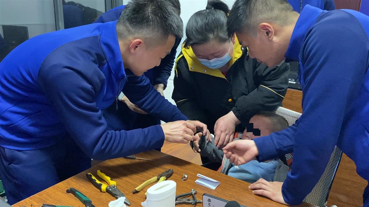 3月6日晚7时许,一名家长带着4岁的男童来到湖北随州市高新区红旗路消防救援站寻求帮助,原因是男童在玩耍时,右手食指不慎被金属圈卡住了,在家尝试多次后均无法取下,便来到消防队寻求帮助。