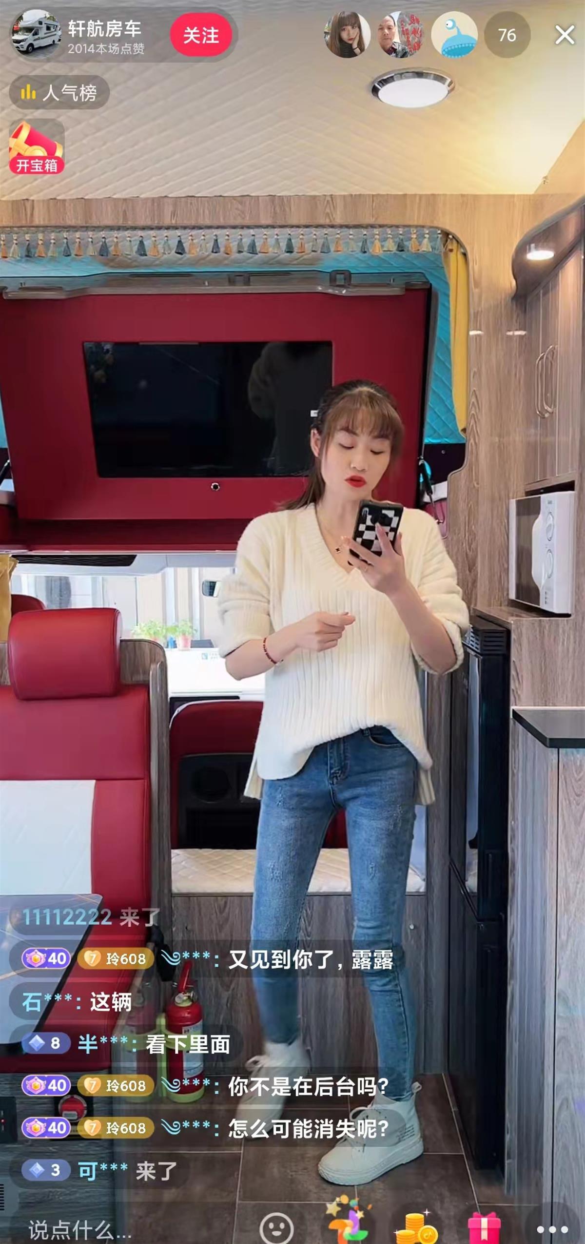 露露说,一开始直播间只有几十个人,大多数还是熟人来看热闹,到现在每场直播都有几千上万人在线,粉丝数也达11万多。今年春节前迎来一波销售高峰,一个月就卖了30台。其中,最受欢迎的是一款售价13.98万元的房车,车主以退休老年人为主。“年前客户催着我们发货,好开到海南过春节”。