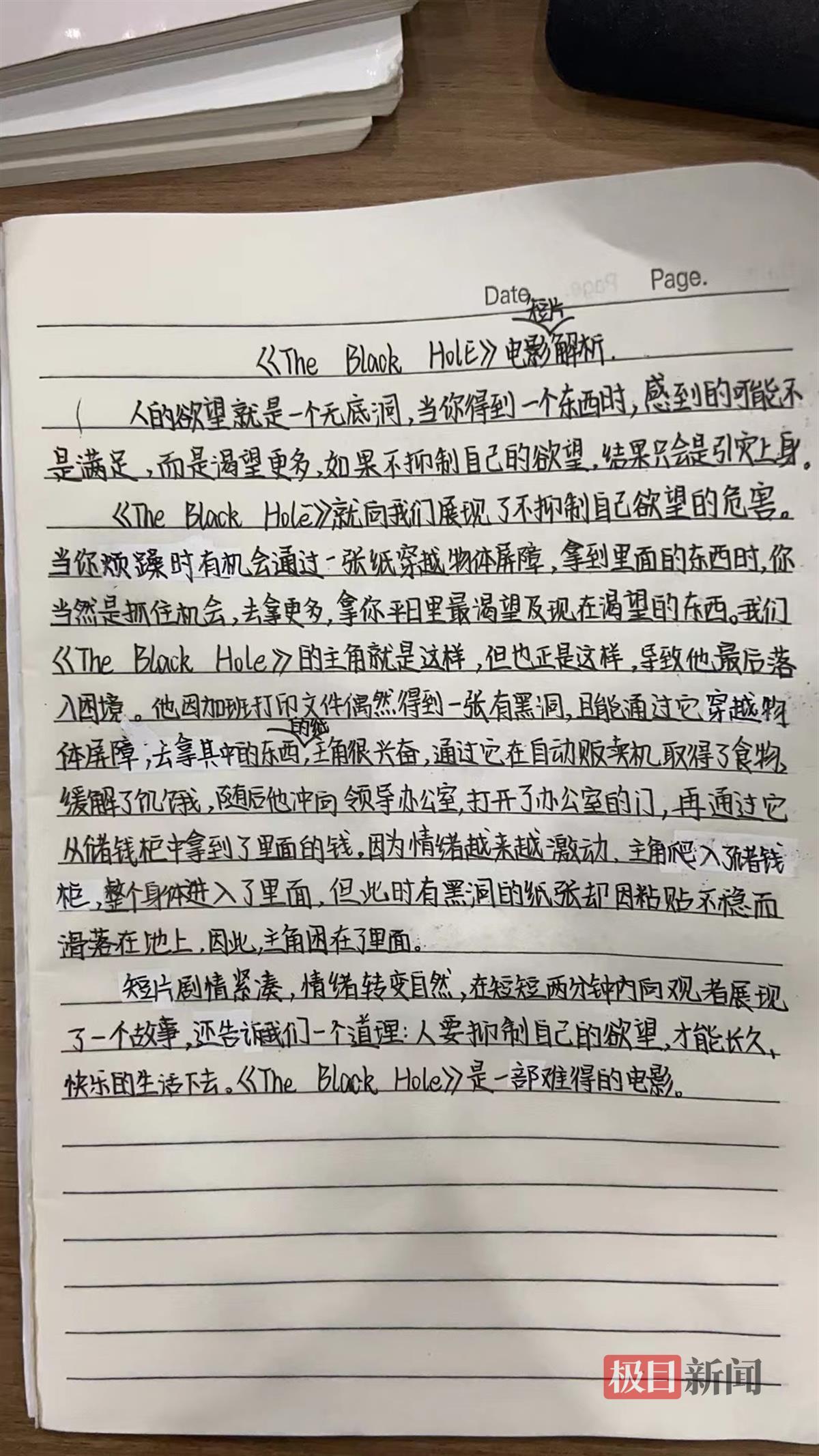 接近一个小时的课程,学生们收获满满,七年级学生张悦倩在课后还尝试写电影短片解析。语文老师万蓉提道,“课堂上所介绍的,所有的电影故事,都讲究起承转合,这与作文教学不谋而合。中学生在写记叙文时,时常不会处理细节,导致情节生硬,情绪递进不自然。在此次课程中,王老师同学生们抽丝剥茧,将一个两分钟的短片剖析得完整而又深入,在他的讲解下,我们仿佛也成为了短片中的人物,去感受他层层递进的情绪。”