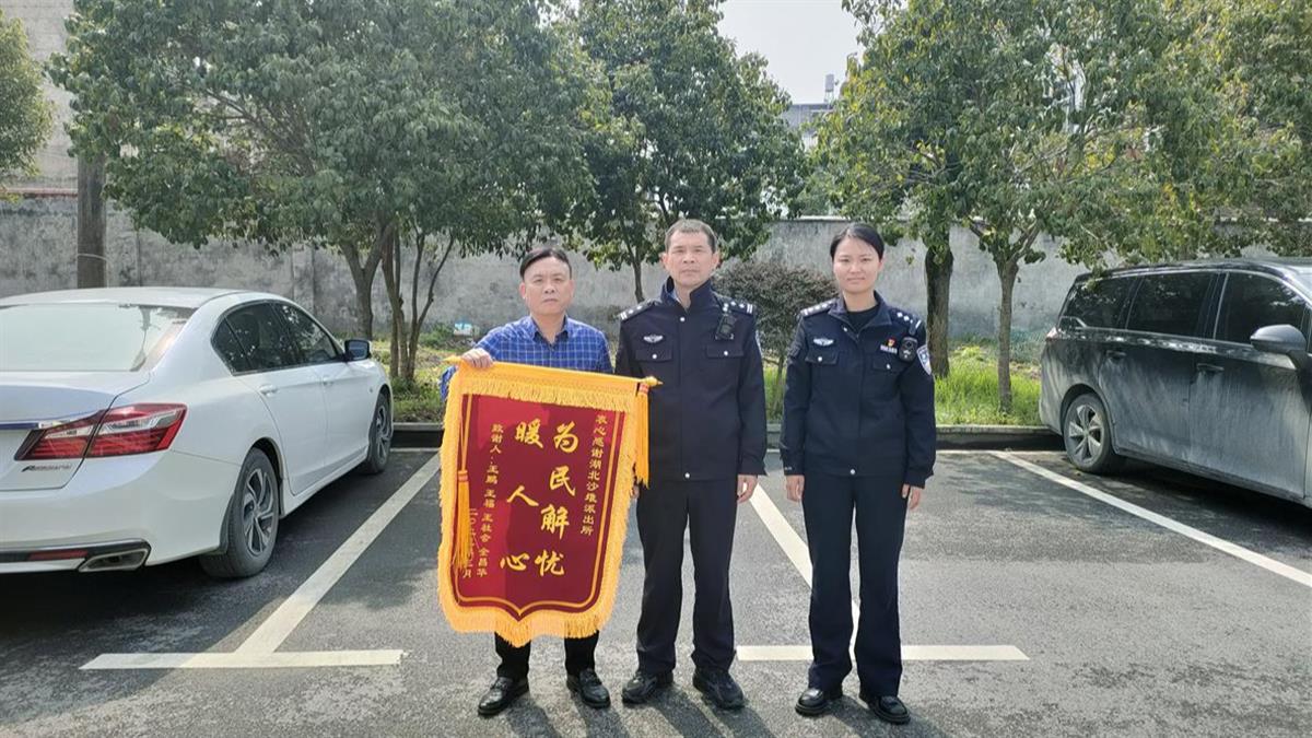 为感谢民警的暖心相助,湖南省衡阳市衡南县全昌华、王社会等兄弟四人一早驱车从衡阳出发,驾驶数百公里,将一面印有“为民解忧暖人心”的锦旗,送到了通城县公安局沙堆派出所民警手中。