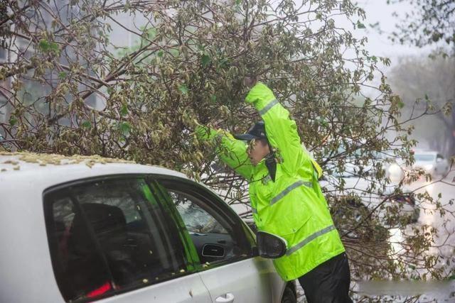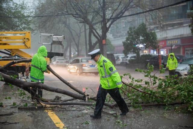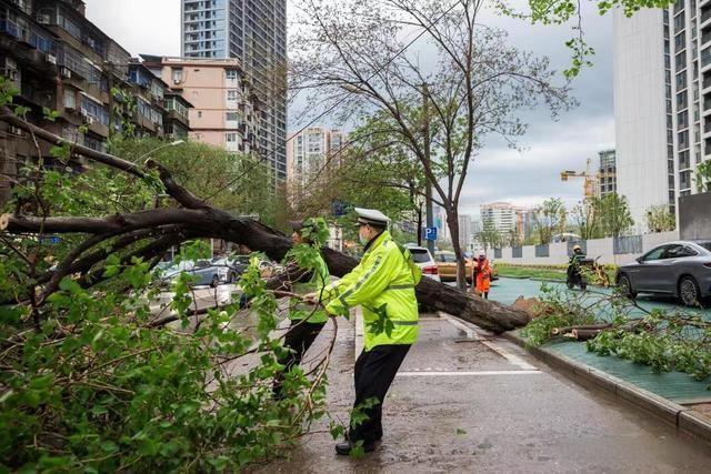 下午近16时,受短时强降水、雷暴大风影响,三眼桥路海景虹公交站附近,一棵大树轰然倒地横在道路中间,截断了双向交通。武汉交警通过视频巡查发现突发状况,江岸区交通大队民警第一时间赶到现场疏导交通,由于倒地的树木枝体较大,现场8名交警兵分两路,一组负责清理路面断枝,为过往车辆腾出了一股通道,另一组则在现场引导过往车辆有序通行,并及时联系路边停放车辆车主及时挪车,排除隐患。