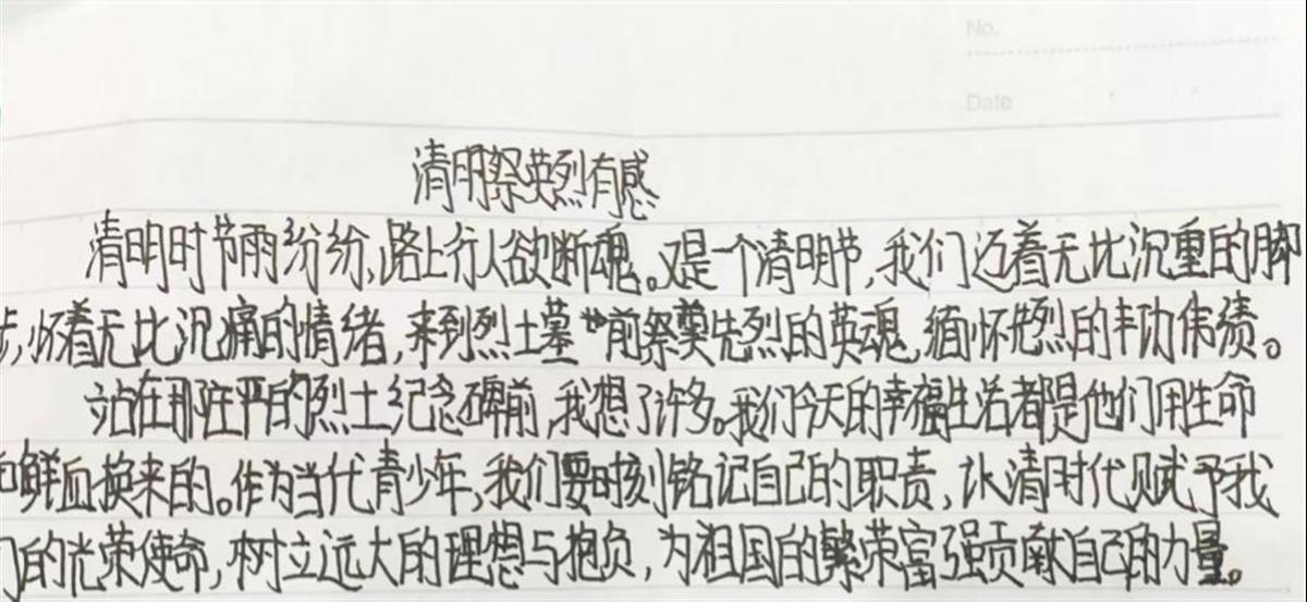 来自501中队的陶奕凝在日记中写到:“站在庄严的烈士纪念碑前,我想了很多。他们在最美好的青春里上了战场,我想向他们讲述他们没有看到的今天,我想向他们承诺,作为当代中国少年,我们一定会认清时代赋予我们的光荣使命,树立远大的理想与抱负,为祖国的繁荣富强贡献自己的力量!”