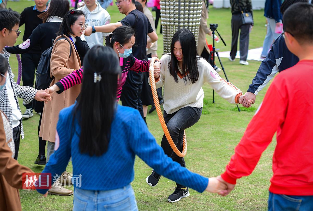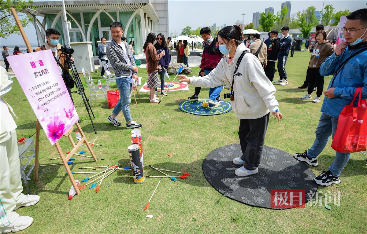 活动主场地两侧,投壶、跳绳、光盘拔河、沙包投掷靶盘等单独游戏区域,男女嘉宾们邀约各自的心仪对象,前往参加体验。