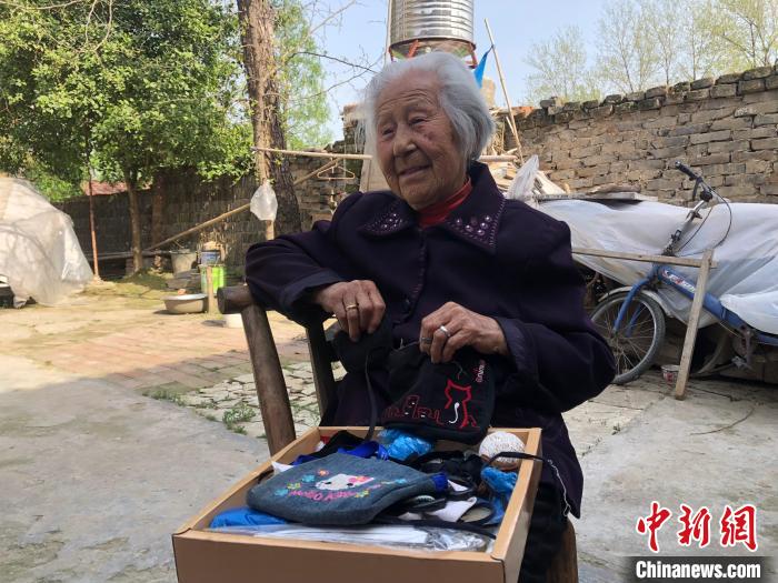 图为4月8日,在世界长寿之乡湖北钟祥,102岁的鞠兰英老人展示自己亲手缝制的零钱袋。 中新社记者梁婷摄