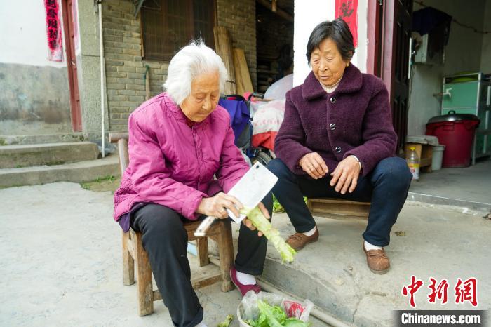图为102岁的鞠兰英老人正在理菜。 中新社记者吴淘淘摄