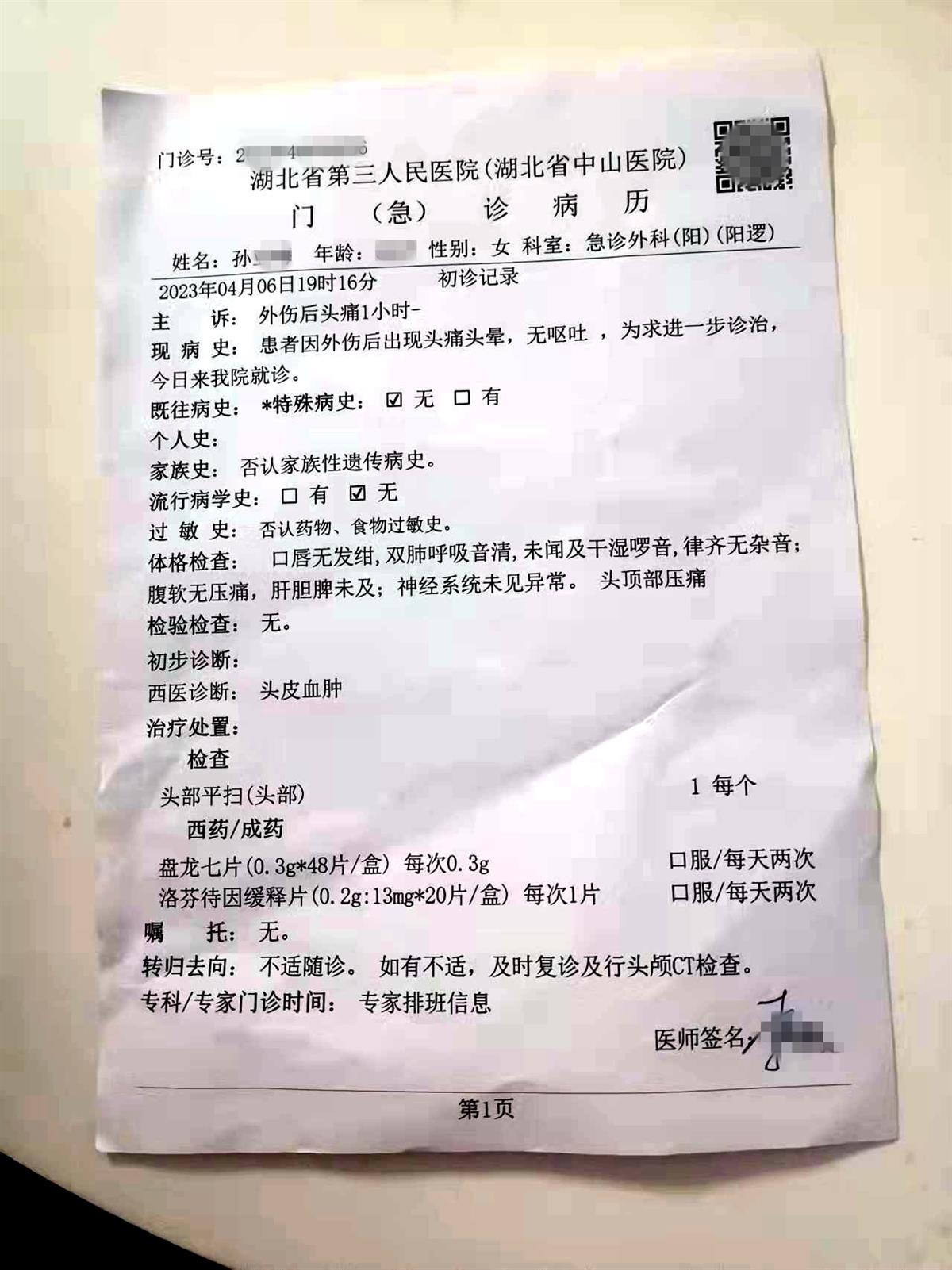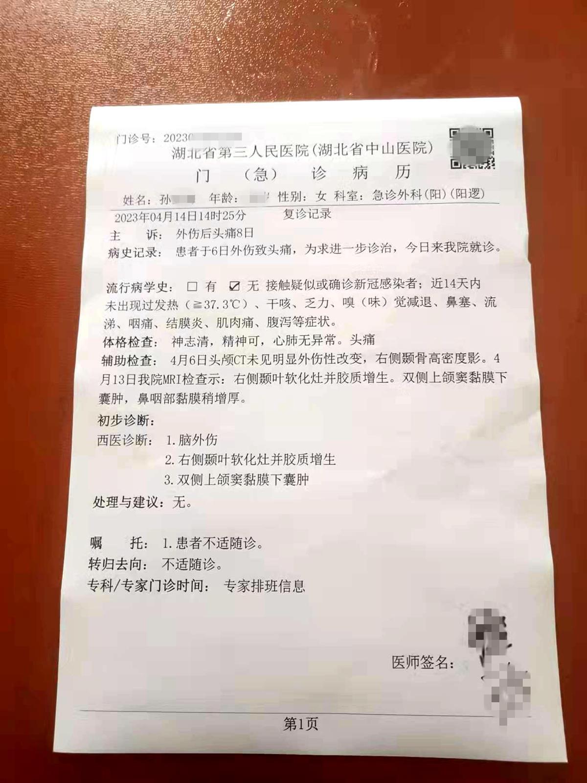 随后,孙女士再给记者看了她的急诊病历照片。病历显示,医生接诊时间大约在4月6日19时16分,记录的患者主诉是外伤后头疼。经过头部平扫等检查,医生初步诊断为头皮血肿,开药后并嘱咐患者如有不适,及时复诊和检查。
