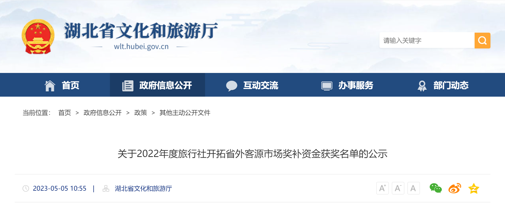关于2022年度旅行社开拓省外客源市场奖补资金获奖名单的公示