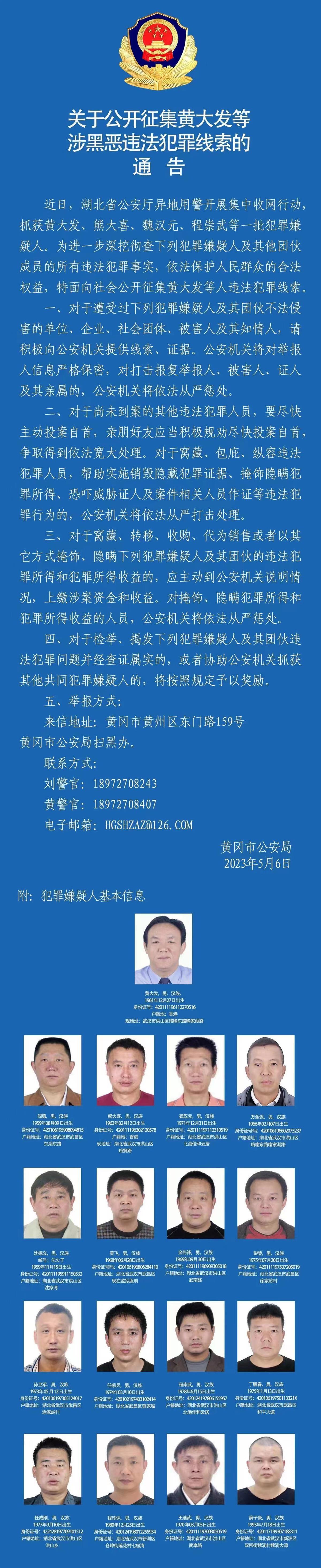 5月6日,湖北黄冈市公安局发布通告,公开征集黄大发等涉黑恶违法犯罪线索。