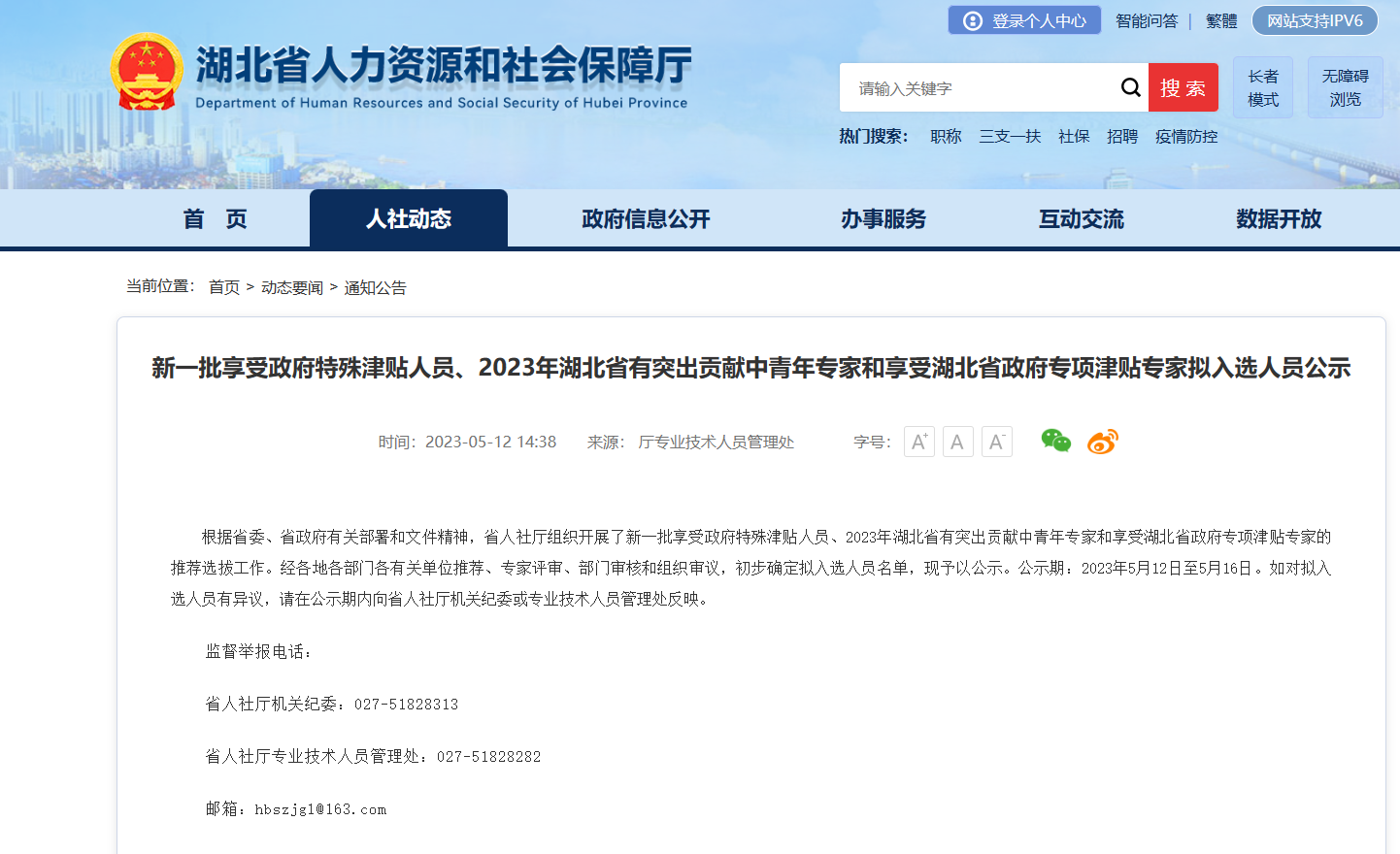 根据省委、省政府有关部署和文件精神,省人社厅组织开展了新一批享受政府特殊津贴人员、2023年湖北省有突出贡献中青年专家和享受湖北省政府专项津贴专家的推荐选拔工作。经各地各部门各有关单位推荐、专家评审、部门审核和组织审议,初步确定拟入选人员名单,现予以公示。公示期:2023年5月12日至5月16日。如对拟入选人员有异议,请在公示期内向省人社厅机关纪委或专业技术人员管理处反映。