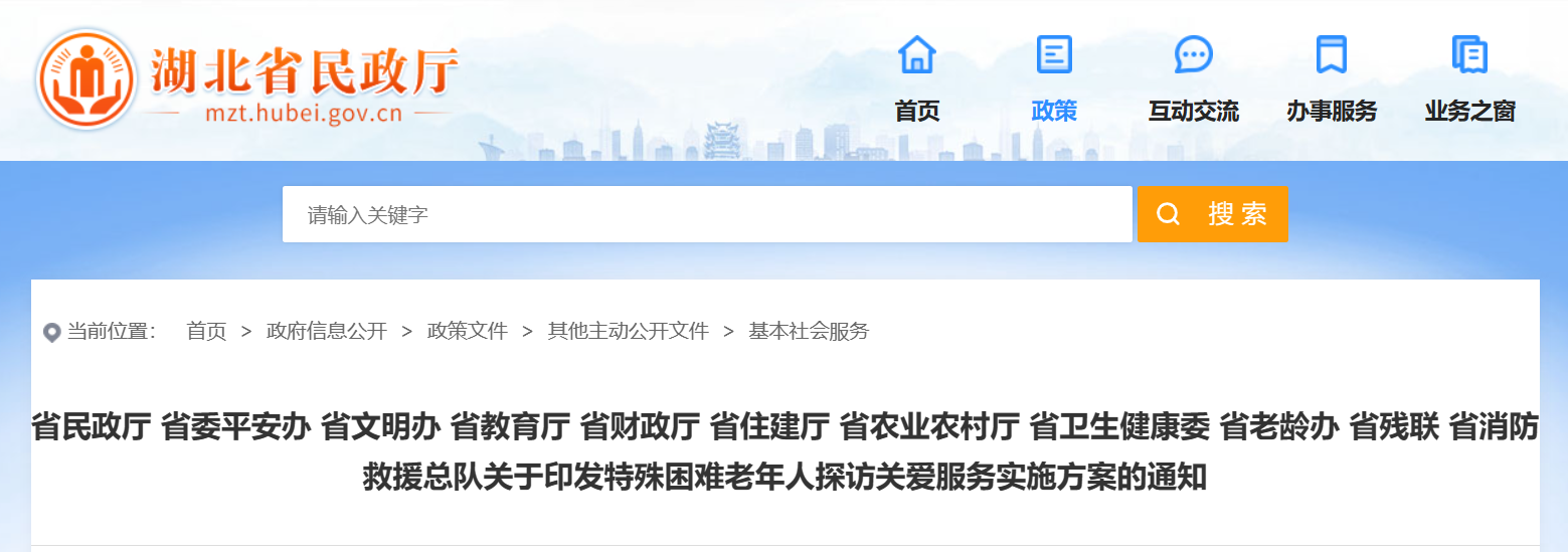 为实施积极应对人口老龄化国家战略,健全我省基本养老服务体系,按照民政部等十部门《关于开展特殊困难老年人探访关爱服务的指导意见》(民发〔2022〕73号)和《省人民政府办公厅印发关于推进基本养老服务体系建设的实施方案的通知》(鄂政办发〔2023〕3号)精神,现就开展特殊困难老年人探访关爱服务制定以下实施方案。