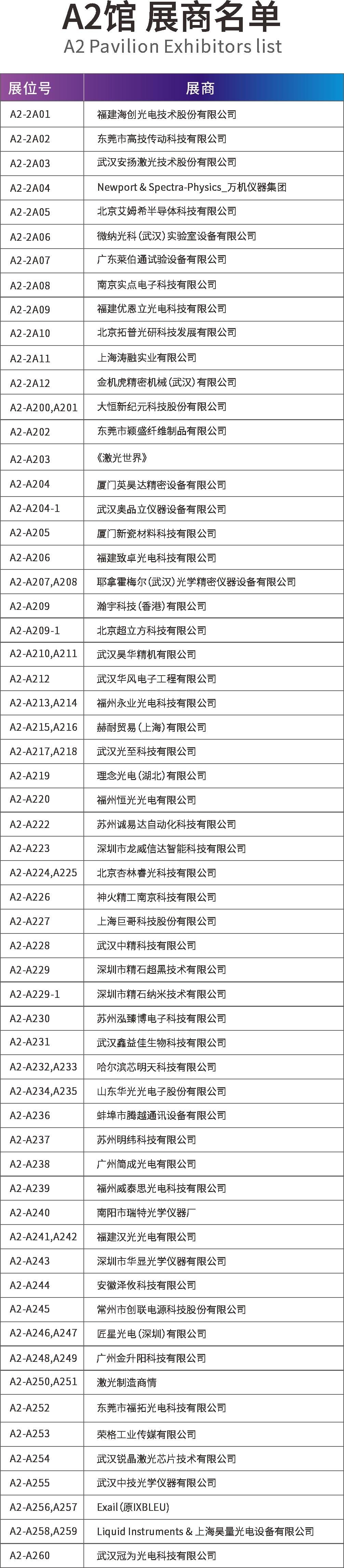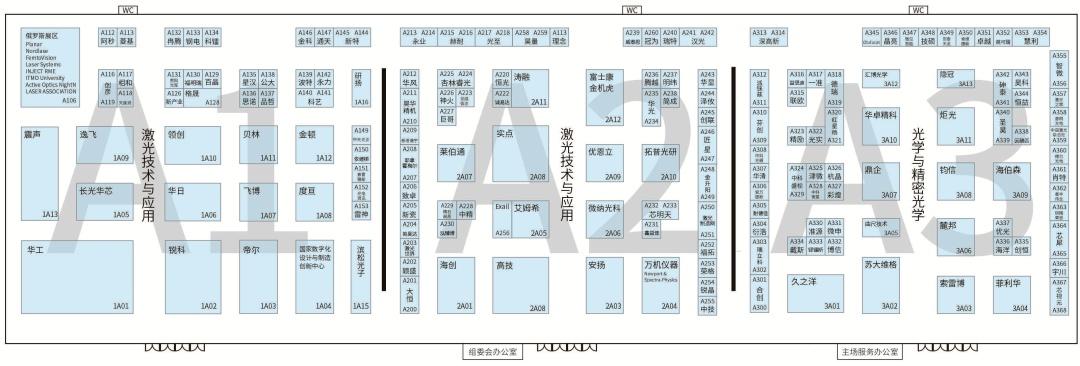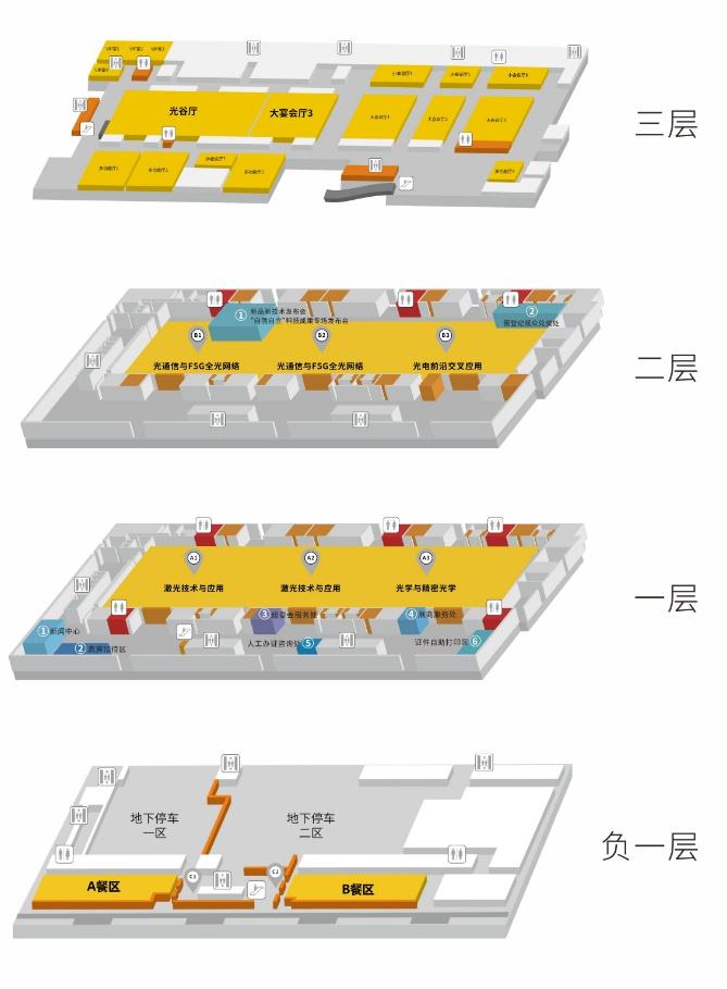 一层:激光技术与应用、光学与精密光学、证件打印处、组委会服务处、新闻中心/展商接待区二层:光通信与F5G全光网络、光电前沿交叉应用、“自立自强”科技成果专场发布会、预登记观众兑奖处三层:同期会议论坛举办处
