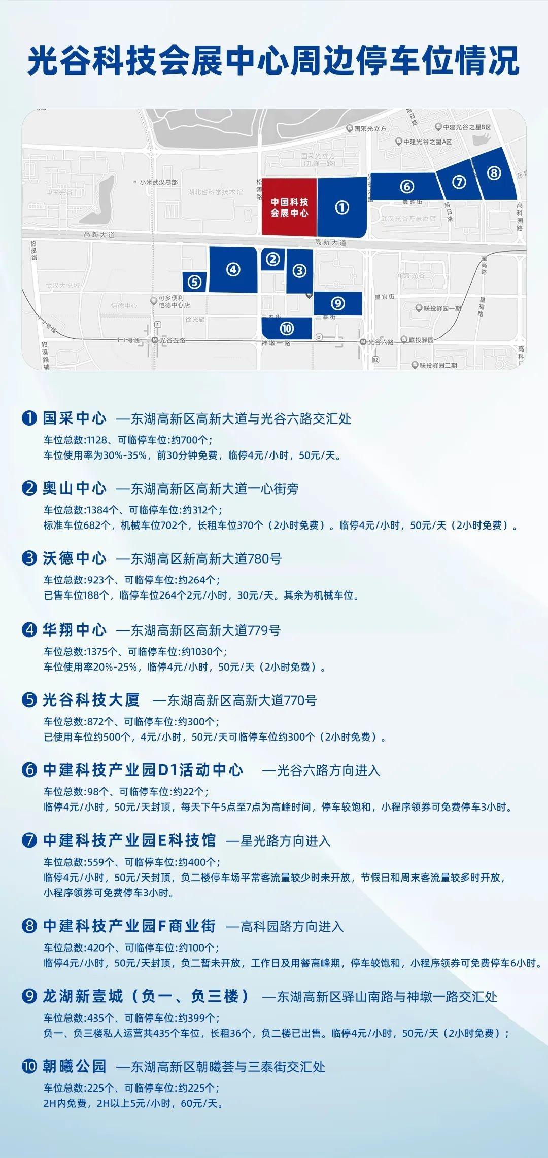 重要提醒:展会期间,展馆周边道路(高新大道、光谷五路、光谷六路、神墩一路、松涛路、高科园路等)严禁停车。对于车辆违停,交管部门将进行严肃处理。为方便大家停车,组委会联络和协调了10处社会停车区域,如下: