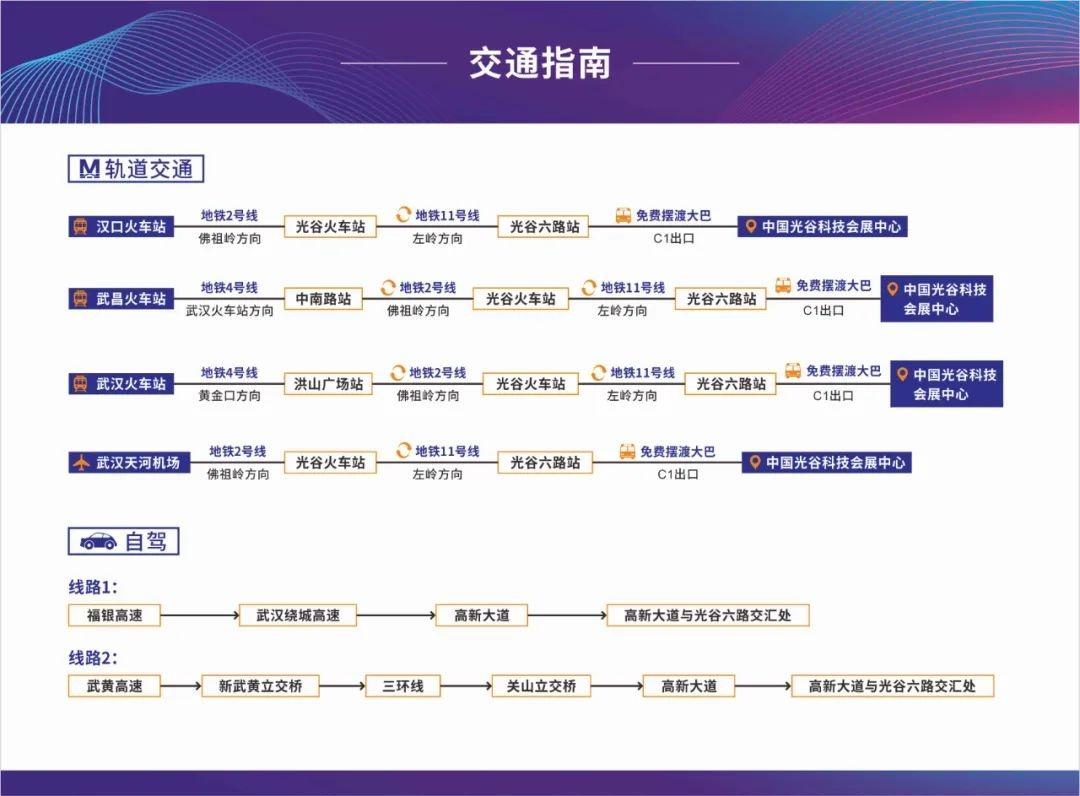 *武汉天河机场:途径2号线、11号线,光谷六路站C1出口乘坐地铁2号线(佛祖岭方向)至光谷火车站(武汉东站)转地铁11号线(左岭方向)至光谷六路站C1出口,乘坐免费摆渡车到中国光谷科技会展中心。
