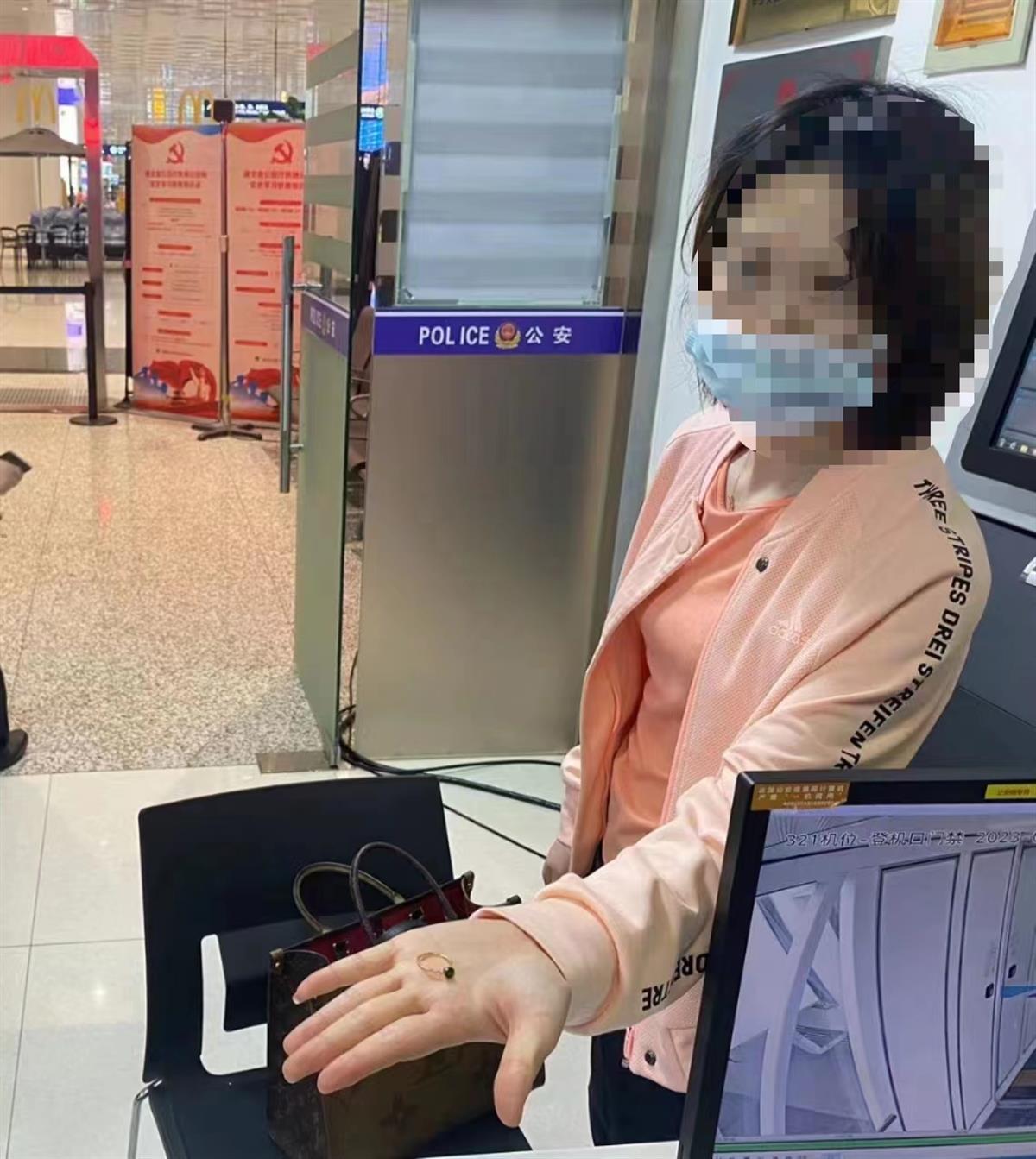 航站区派出所民警告诉极目新闻记者,接到尤女士的求助后,该所立即展开调查。在与天河机场失物招领处和物业公司联系寻找未果后,该所辅警樊毅根据尤女士的回忆,调取了戒指遗失地点附近的监控视频,试图在视频中寻找蛛丝马迹。在与尤女士沟通和查看监控的过程中,樊毅发现15日上午8时36分,尤女士在登机口处擦护手霜时,有取下戒指的动作,但由于戒指较小,当时人流量较大,监控无法直观看出戒指是否掉落在地。