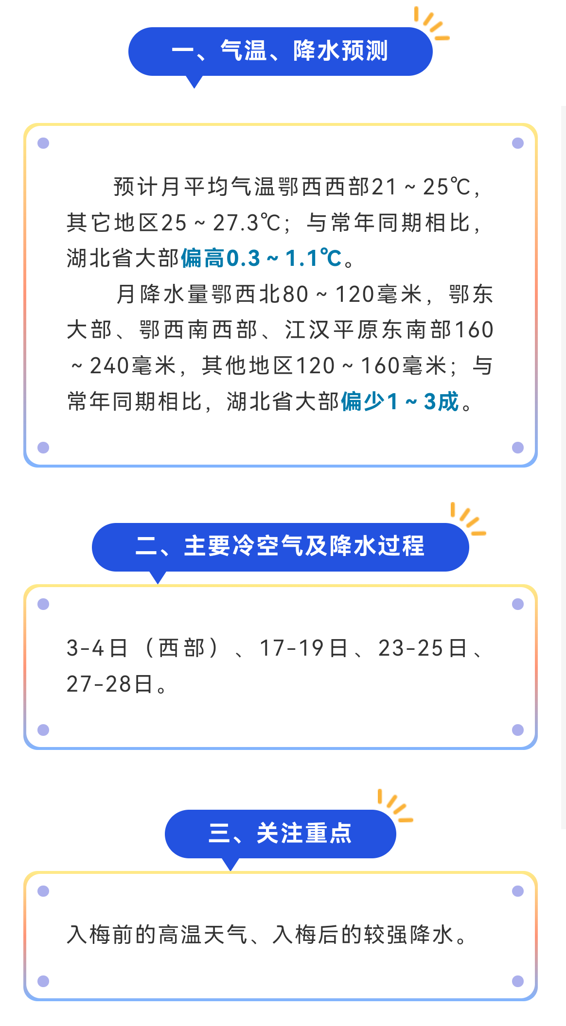 6月全省主要冷空气及降水过程集中在3-4日(西部)、17-19日、23-25日、27-28日。