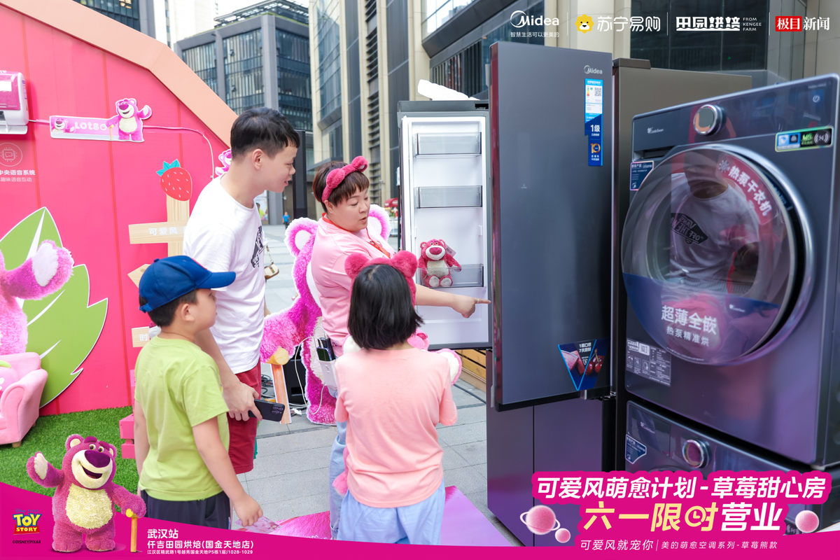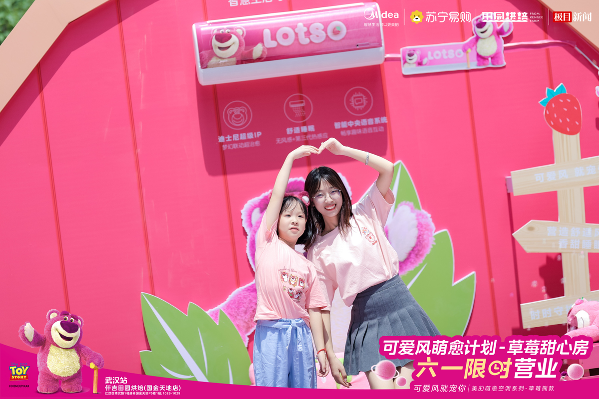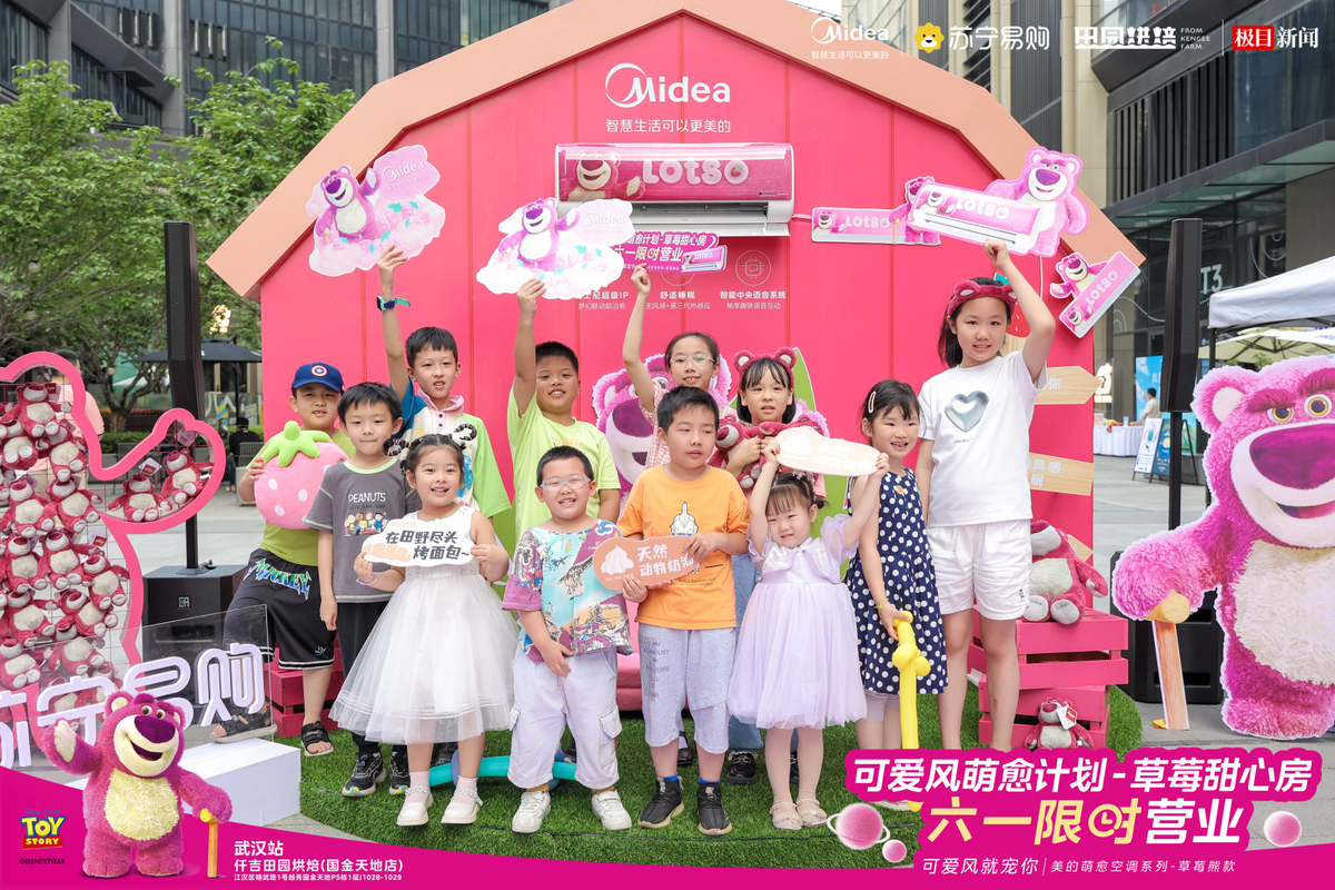 “妈妈,这是《玩具总动员》里的草莓熊!”“妈妈快扫码!可以参加打卡赢奖品的活动哦!”“我要抱着草莓熊再拍一张!”……原来,这个新晋的六一打卡胜地,是由美的电器特别为小朋友们准备的。当天下午三点整,美的草莓熊儿童空调新品发布会在这里萌动开场。