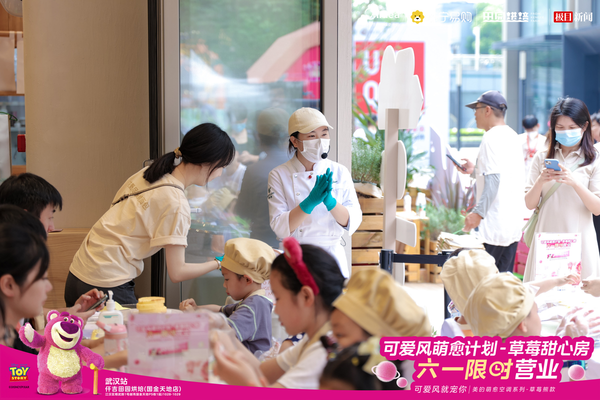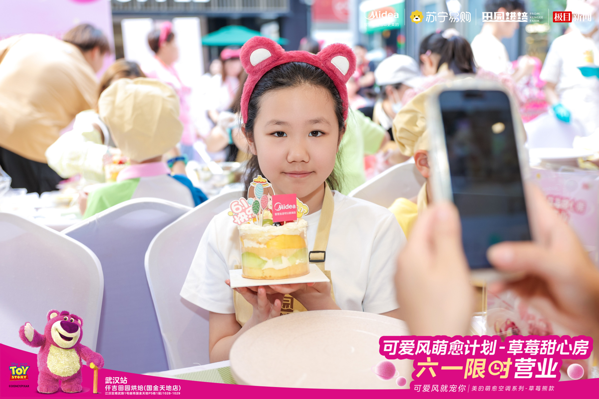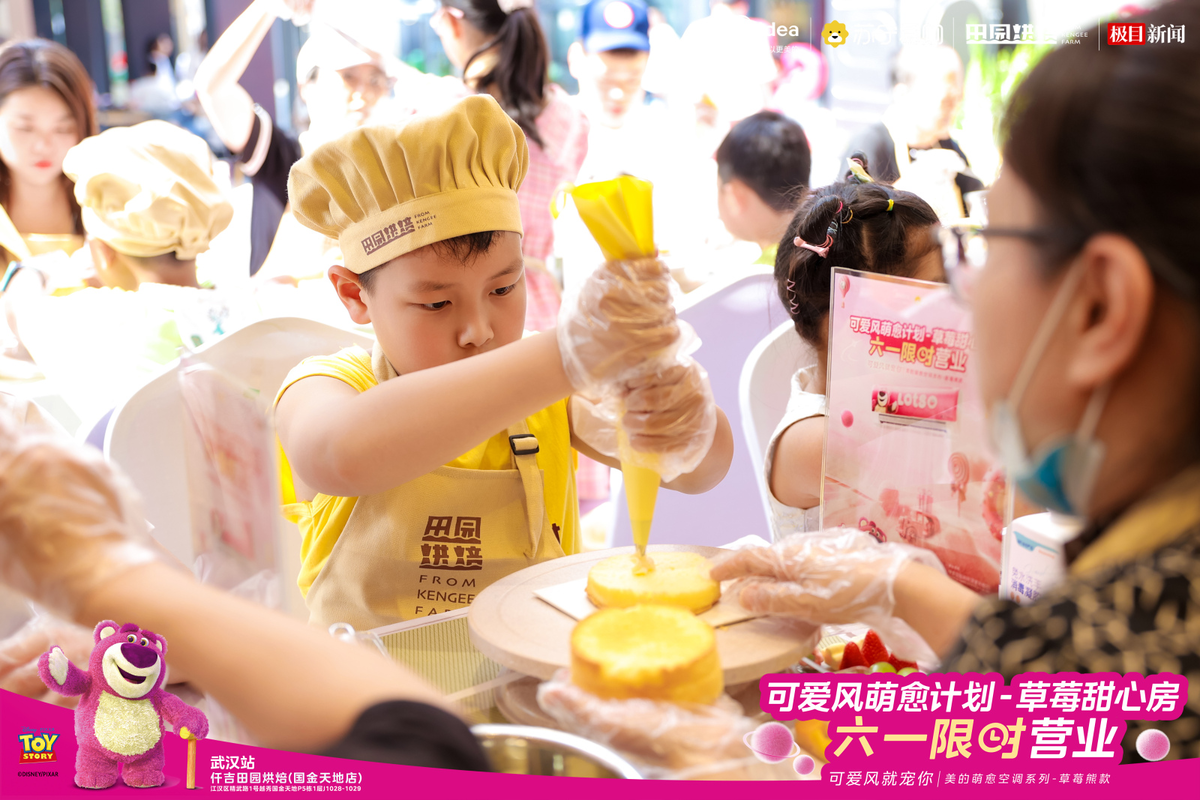 如果说,美的空调带来的草莓熊萌愈系列是一种视觉和触觉的情绪治愈“神器”,那么接下来的仟吉田园烘焙DIY环节则是一种嗅觉和味觉的美好治愈。6月1日下午,在简洁而干货满满的新品发布会之后,美的空调与仟吉田园烘焙联手为极目新闻前期征集的15组亲子家庭,带来了一场欢乐爆棚的奶油蛋糕体验秀。