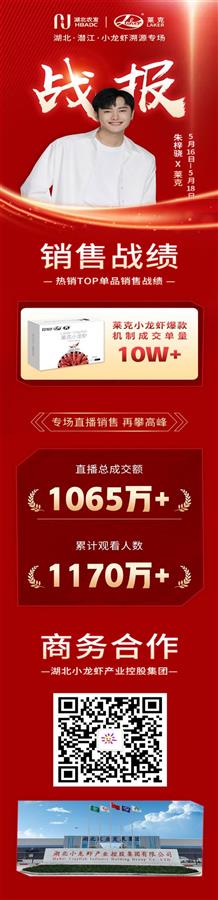 5月16日,朱梓骁开始在直播间为莱克小龙虾带货。没想到,直播效果出乎意料的好:5月16日—18日,3天直播,该产品销量火爆——成交量超过10万单,成交额超过1000万元,累计观看人数超过1170万。该产品成为当月抖音小龙虾爆款榜榜首。