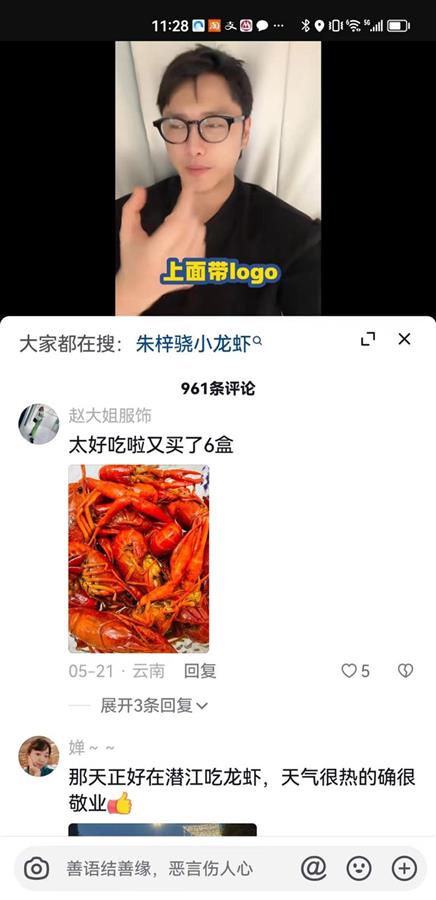 而在抖音平台上,许多购买过该产品的粉丝,在评论区留言称赞小龙虾味道好:“我们连续吃了六天,给我们店里所有人都安利,她们都买了,真的是前所未有的好吃,绝绝子。”“一天一盒,三天吃完了,一个人吃。”“太太太好吃了,一口气炫了三盒没过瘾,下次囤十几盒。”……