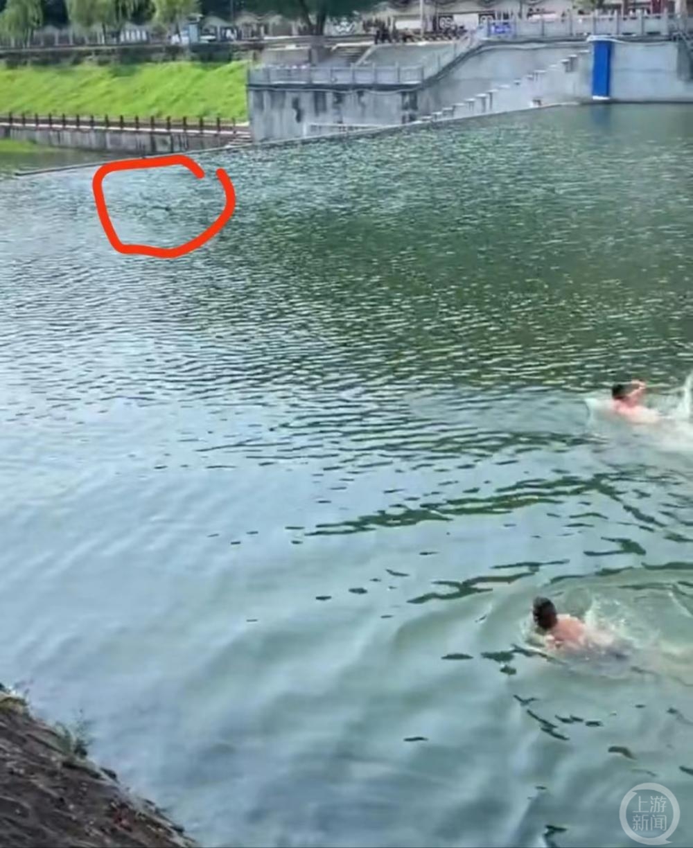上游新闻记者获得的视频显示,蛮河中间有一女子,她的身体时而上浮,时而下沉。两名男子奋力朝她游去。随后,其中一男子抱住女子,朝岸边游去。快接近岸边时,第三名男子下河援手。最终,女子被救上岸。