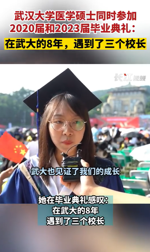 6月20日,武汉大学2023年毕业典礼举行。2023届、2020届,17000人齐聚九一二体育场,超大规模的典礼阵容,定格最美的珞珈时光,双届同庆。来自武汉大学医学院的周慧琴今天同时参加2020届本科毕业典礼和2023届硕士毕业典礼。她在毕业典礼感叹:“在武大的8年,遇到了三个校长。”