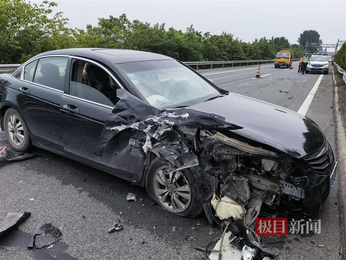 6月22日12时许,湖北高速交警监利大队值班室接到报警,一辆黑色小型汽车在许广高速仙桃段撞到一辆掉落在超车道上的商品车,现场情况十分紧急。