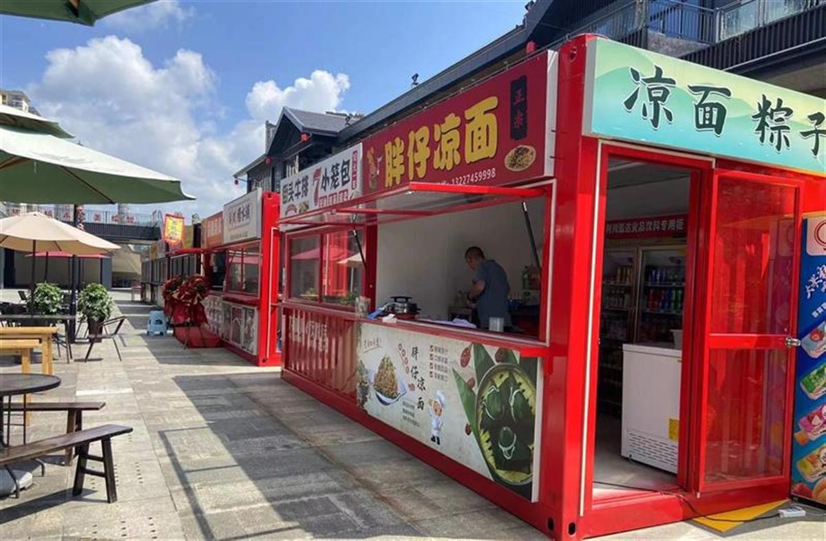 “我们这个经营的棚子很好,里面的水、电设施齐全,很方便,不用每天搬进搬出。”在龙船调公园商业街内经营胖仔凉面的周先生说。