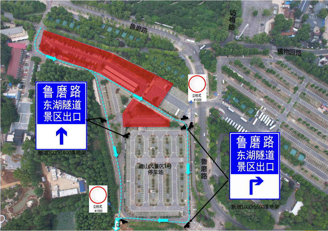 1、自驾游:建议将车停在梅园东停车场,步行约三分钟抵达磨山景区。如将车停放在磨山景区停车场的游客,请从以下出口驶出。(先交费后驶出,避免堵塞)
