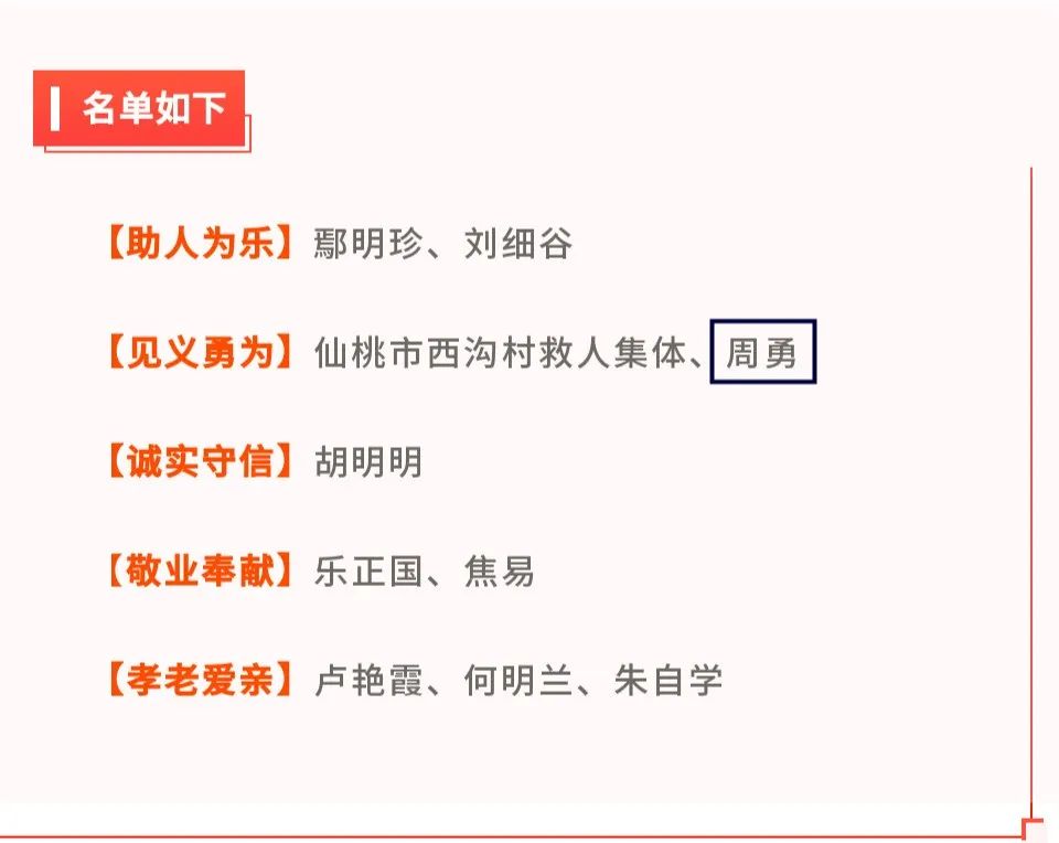此次发布的“湖北好人”名单,是今年公布的第二批“湖北好人”,其中助人为乐2人、见义勇为2人(组)、诚实守信1人、敬业奉献2人、孝老爱亲3人。