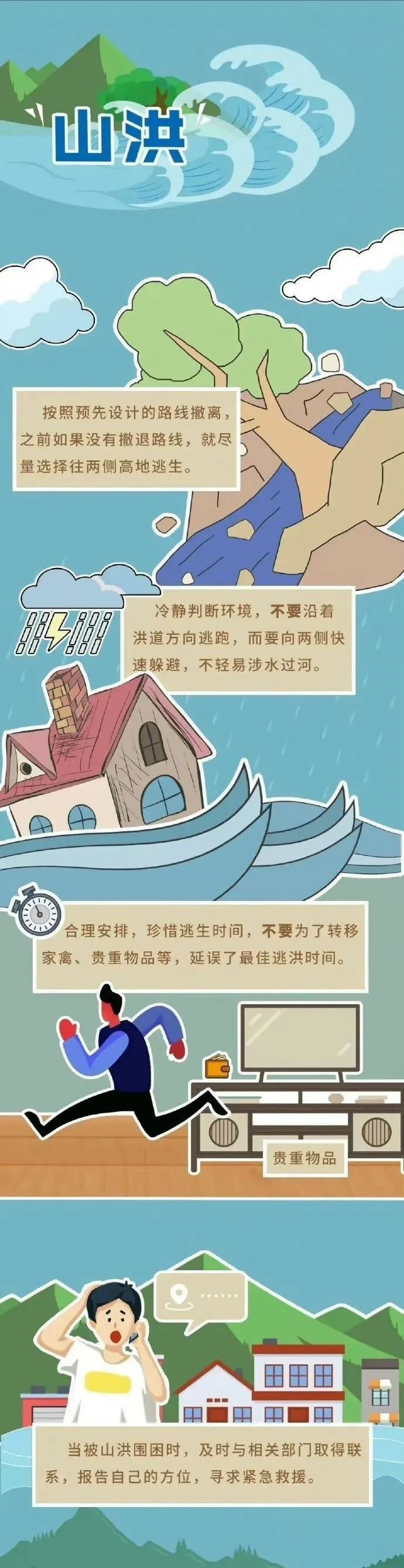 山洪具有突发性,一般出现在一次降雨的高峰期,或者连续强降雨发生之后,水量集中流速大,冲刷破坏力强,常常冲毁房屋、田地、道路和桥梁。因此夏季在山区居住或是旅游,一旦发现溪水变浑浊,远处水流轰鸣声加大,水位上升迅速等现象,应提高警觉,迅速向山坡、高地转移,切不可顺着河道往下游走。如果被洪水围困,应及时寻求当地政府或部门救援,不可贸然趟水。