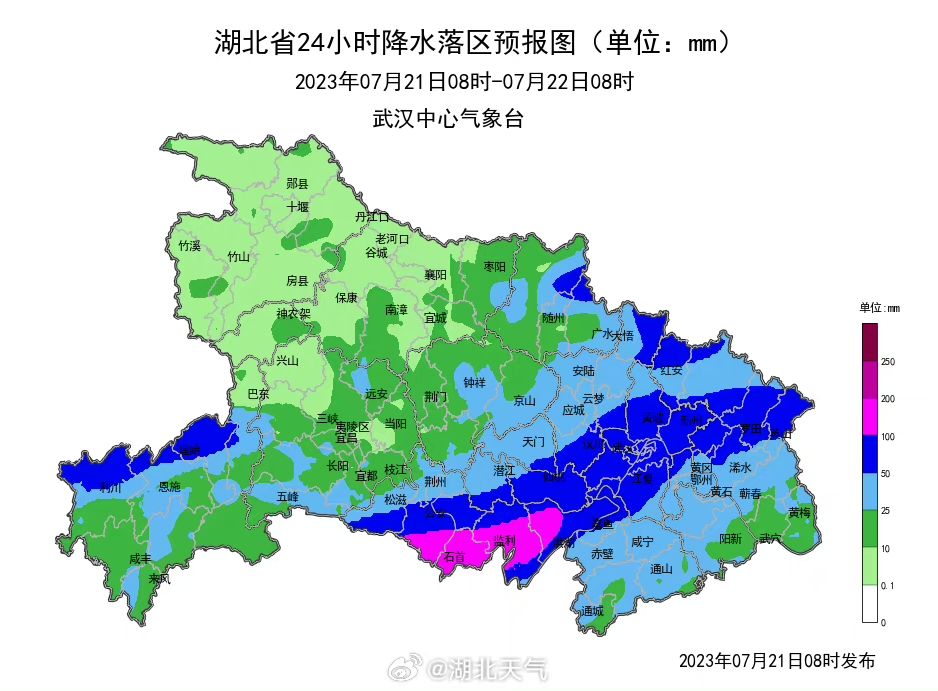 昨天(20日),鄂西北北部和恩施南部出现中到大雨,局部暴雨,其他地区小到中阵雨为主,雨量最大为十堰丹江口浪河91毫米,小时雨强最大为十堰元和观66毫米(21日05时)。最高气温大部地区30~35℃,鄂西北西部35~37℃。