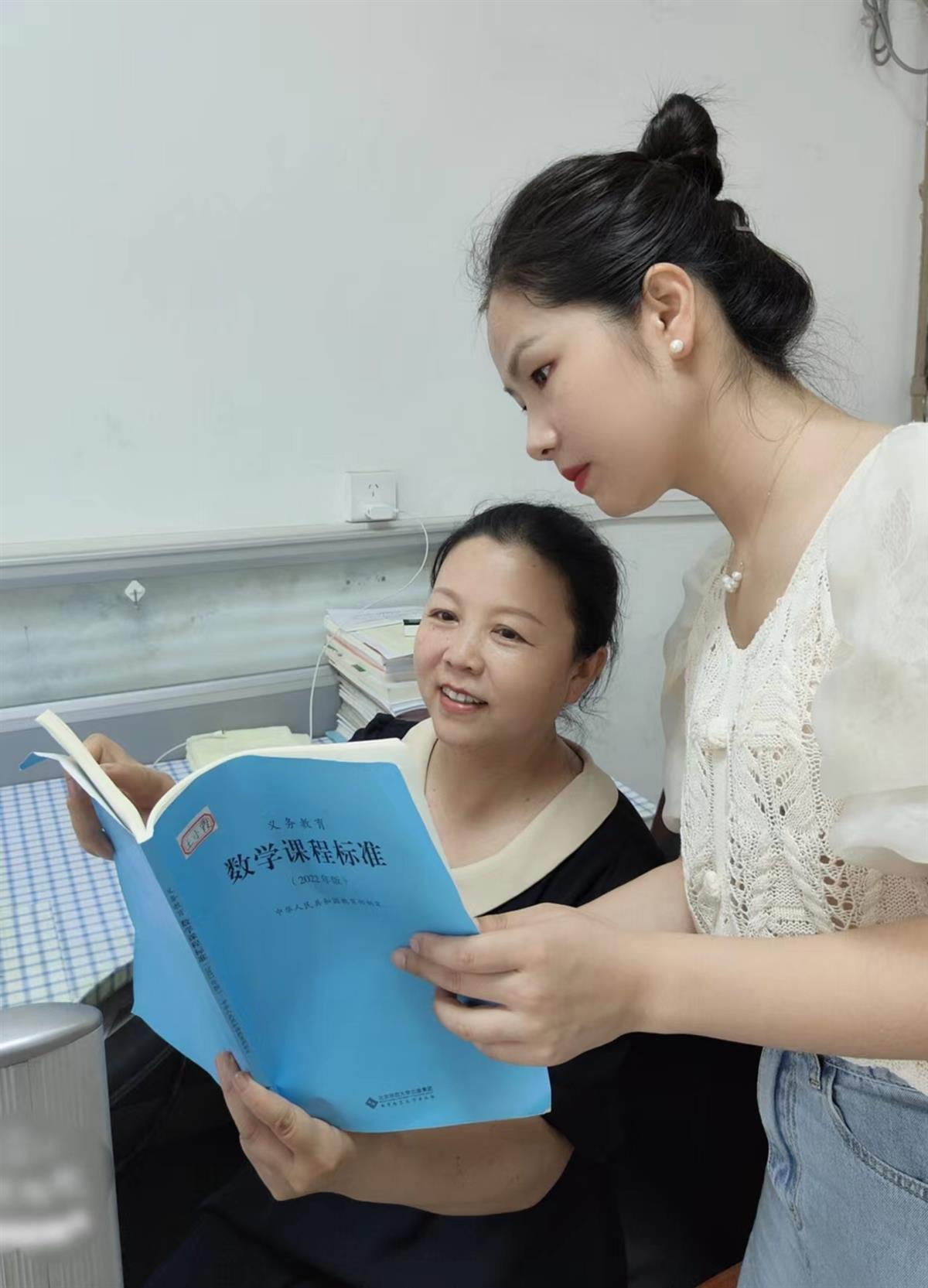 监利市实验小学教师唐九萍(左)与年轻教师探讨教学