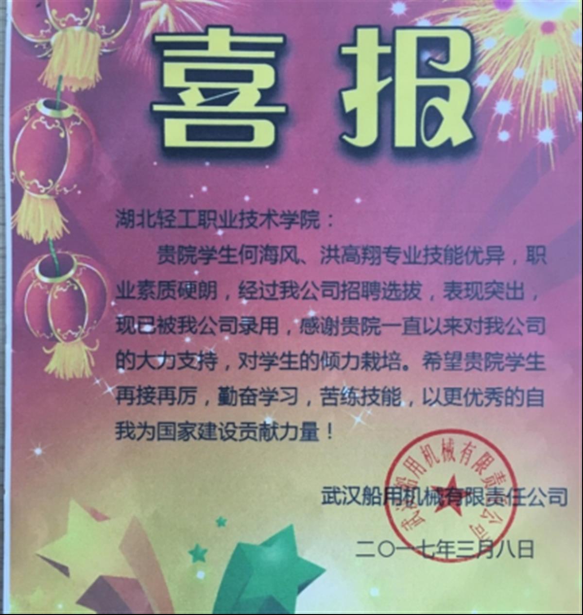 我院积极贯彻落实国家职教改革的各项方针政策,始终站在职教改革的前沿,关心关注每一名学生,坚持立德树人,认真抓好“三全育人”、“三教改革”等各项工作。通过多年教学实践的积累与探索,为社会培养了一大批高素质技术技能人才,每年向中船重工、东风汽车、德国克朗斯公司(Krones)、德国伟巴斯特公司(Webasto)、农夫山泉、华中数控、统一集团、顶津集团等公司输送人才,历届毕业生的实际就业率达99%,企业评价满意率达90%以上。