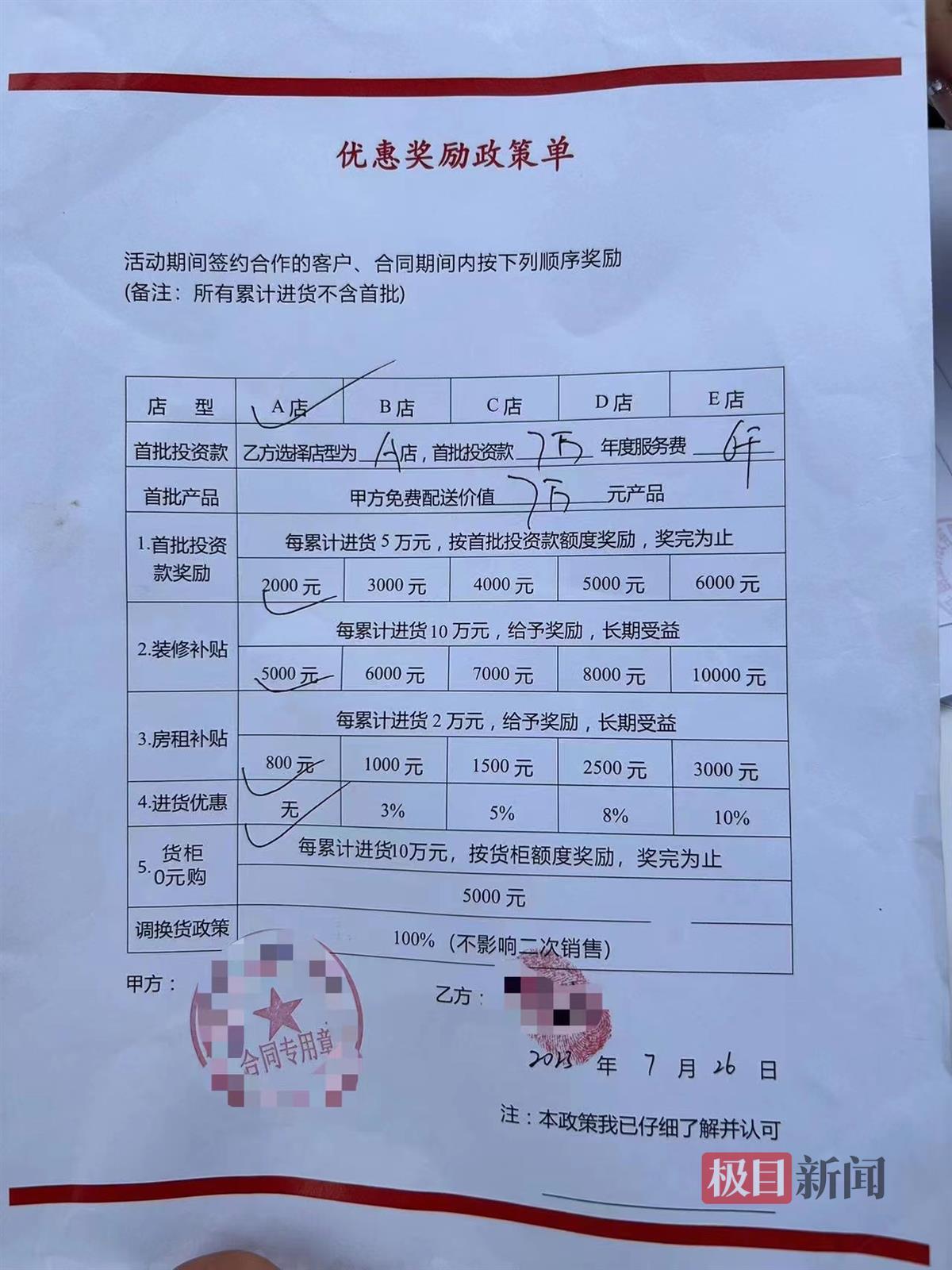 记者看到,根据双方的协议,廖先生所出的7万6千块分为了两部分,一部分7万块属于首批投资款,6千块为年度服务费。但是对于这一项廖先生却不认同,他表示此前双方沟通的时候一直说的是货款,不知道为什么却变成了投资款,此外,在一张名为“优惠奖励政策单”上,记者看到首批产品为甲方赠送的,首批投资款奖励的前提是每累计进货5万元,按首批投资款额度奖励,廖先生每次可以奖励2000元,奖完为止。除了首批投资款奖励外,记者在这张优惠奖励政策单上,还看到有装修补贴、房租补贴、进货优惠等,但前提都是累计进货才可以奖励,“他这个就是文字游戏,是套路,需要你不断投钱进去。”廖先生表示这些所谓的奖励也不是奖励现金,而是奖励同等价值的商品。