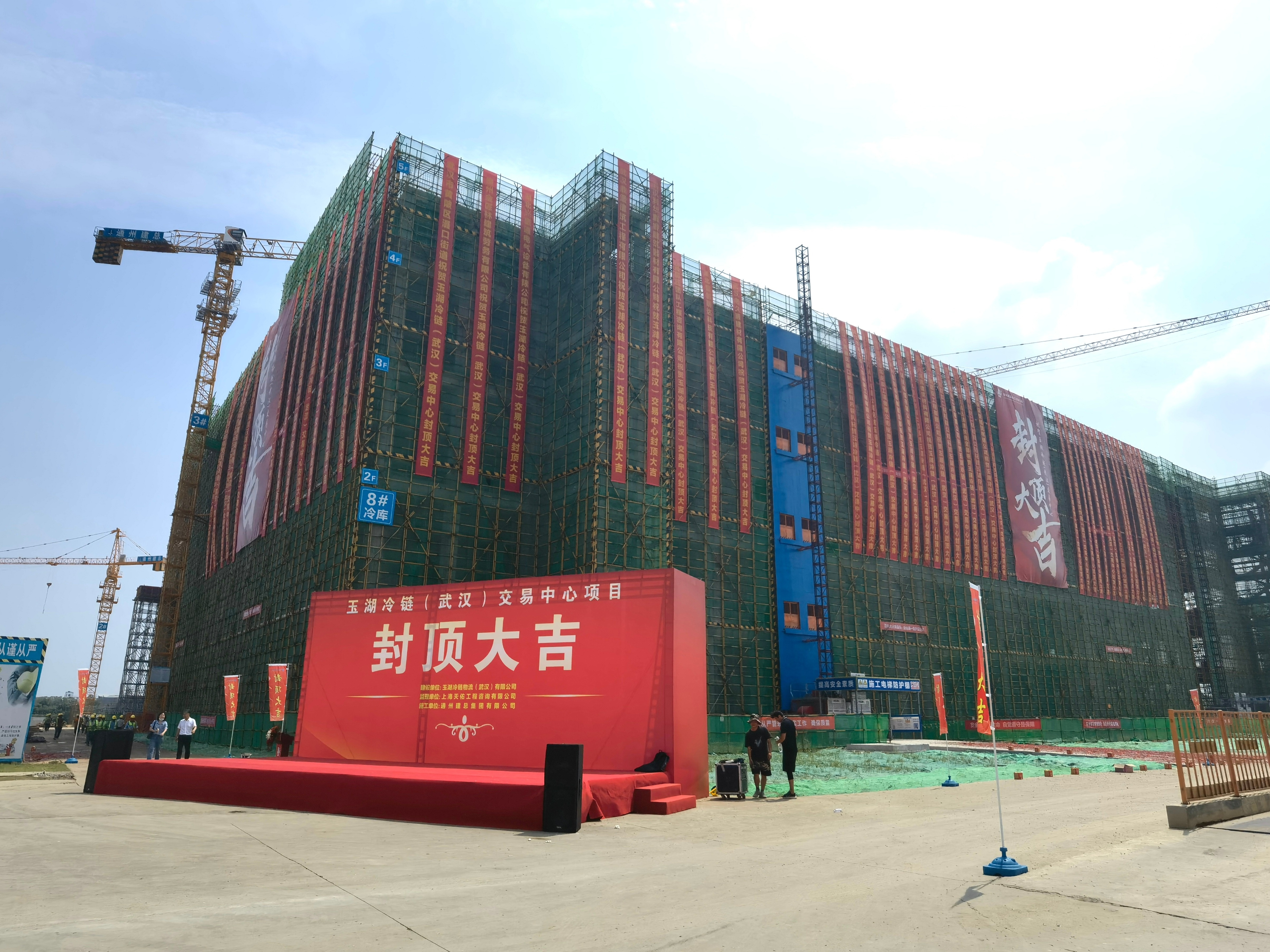 8月19日,在黄陂区滠口街道,随着最后一块混凝土顶板浇筑完成,玉湖冷链(武汉)交易中心产业园单体结构最大的一座冷库——8号冷库迎来封顶,标志着整个项目主体结构施工进入尾声。