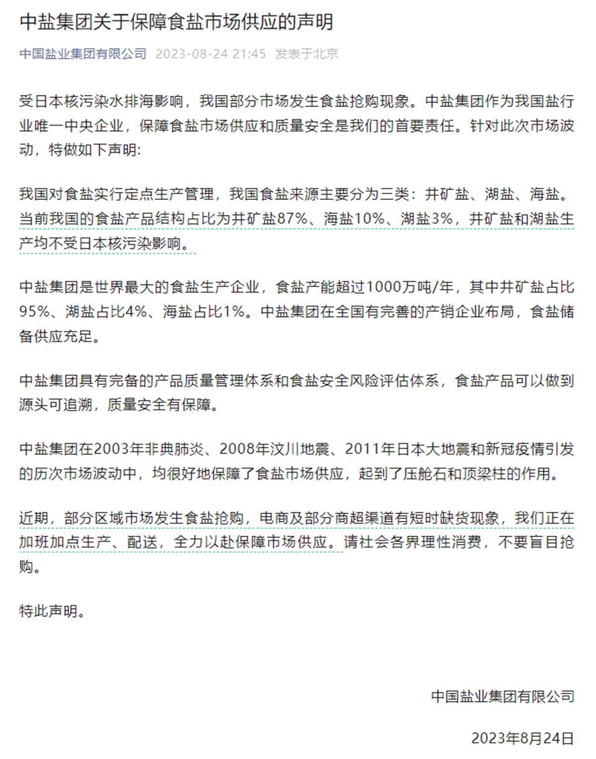 针对部分市场发生食盐抢购现象,中国盐业集团有限公司于8月24日发布声明。声明称,中盐集团是世界最大的食盐生产企业,食盐产能超过1000万吨/年,其中井矿盐占比95%、湖盐占比4%、海盐占比1%。中盐集团在全国有完善的产销企业布局,食盐储备供应充足。