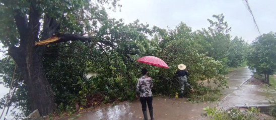 沙道观镇向家渡村组织人员清理因大风吹倒阻碍交通的树木