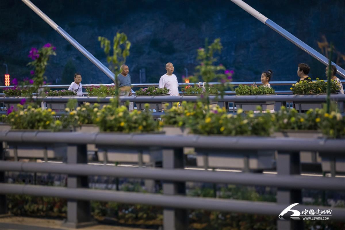 傍晚,乘着微微凉意,居民沿着金建大道两侧步游道散步聊天,外地游客站在火车站转盘花坛处,听着周边音响放着的歌,对着具有土家族特色的西兰卡普人行道连连拍照,车辆沿着路边明亮的灯光飞速行驶着……呈现出一片惬意悠闲的景象。