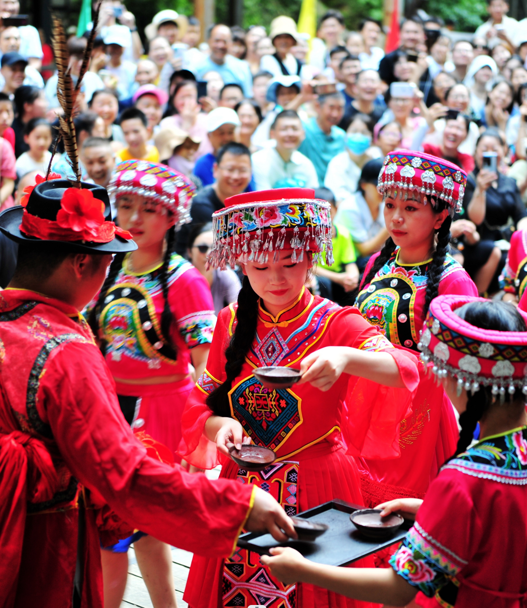 7月29日,游客在宜昌市夷陵区三峡人家风景区观赏土家婚俗展演,“零距离”感受传统文化之美。(视界网 张国荣 摄)