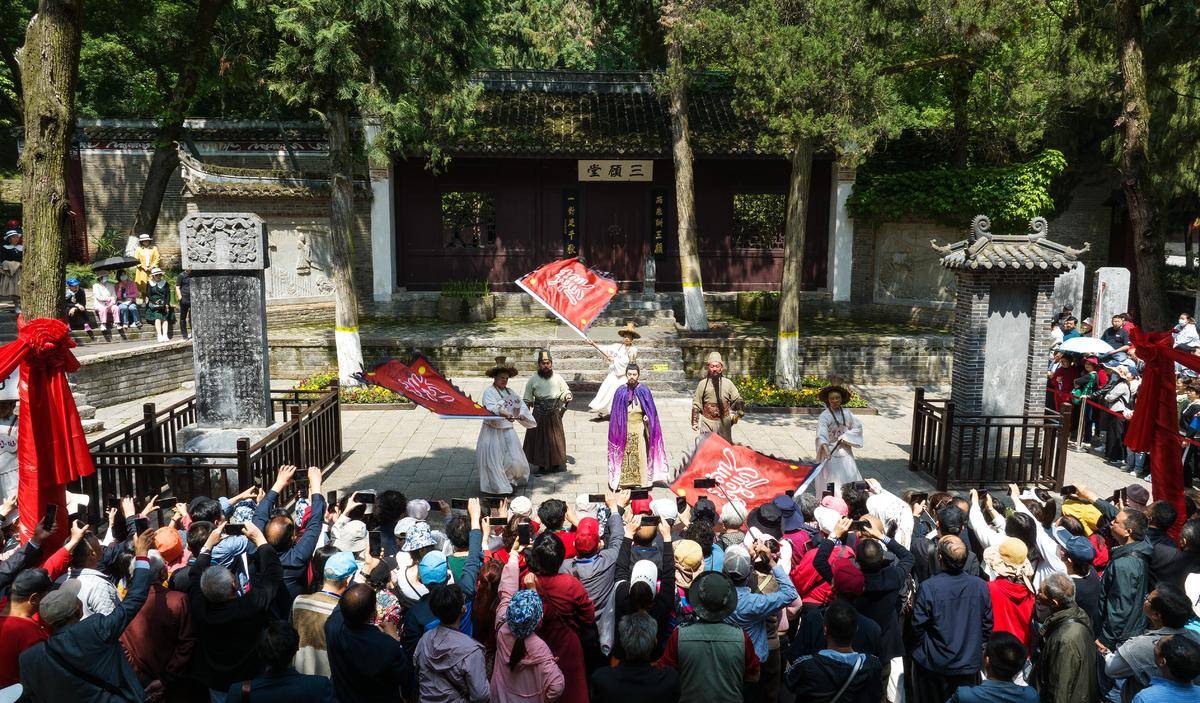 4月26日,游客在襄阳古隆中风景区观看实景演出《三顾茅庐》。(视界网 杨东 摄)