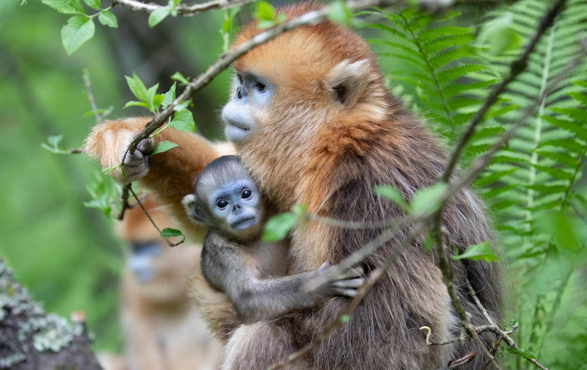 神农架国家公园科学研究院大龙潭金丝猴野外研究基地,金丝猴宝宝躲在母猴怀中。(湖北日报全媒记者 柯皓 摄)