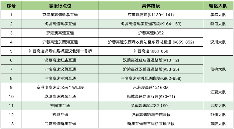 武汉绕城高速:花山收费站及互通、九龙互通附近、豹澥至凤凰山收费站附近;