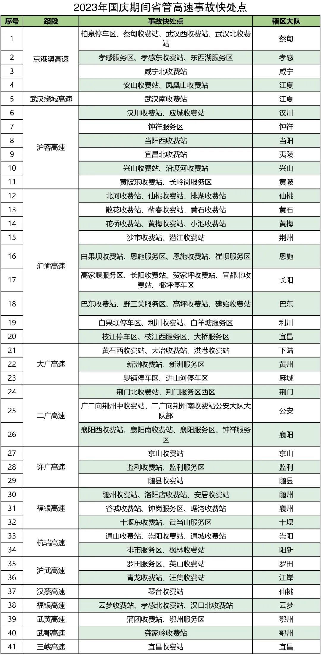 返程途中,遇到交通事故怎么办?湖北高速交警在全省干线高速设置94个事故快处点。如果事故轻微、无人员伤亡、车辆可移动,请迅速拍照固定现场,在确保安全的前提下就近前往快处点处理。