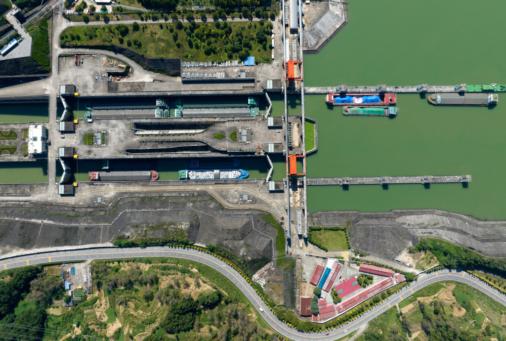 10月8日,在湖北省宜昌市,船舶有序通过三峡双线五级船闸(无人机照片)。新华社发(王罡摄)