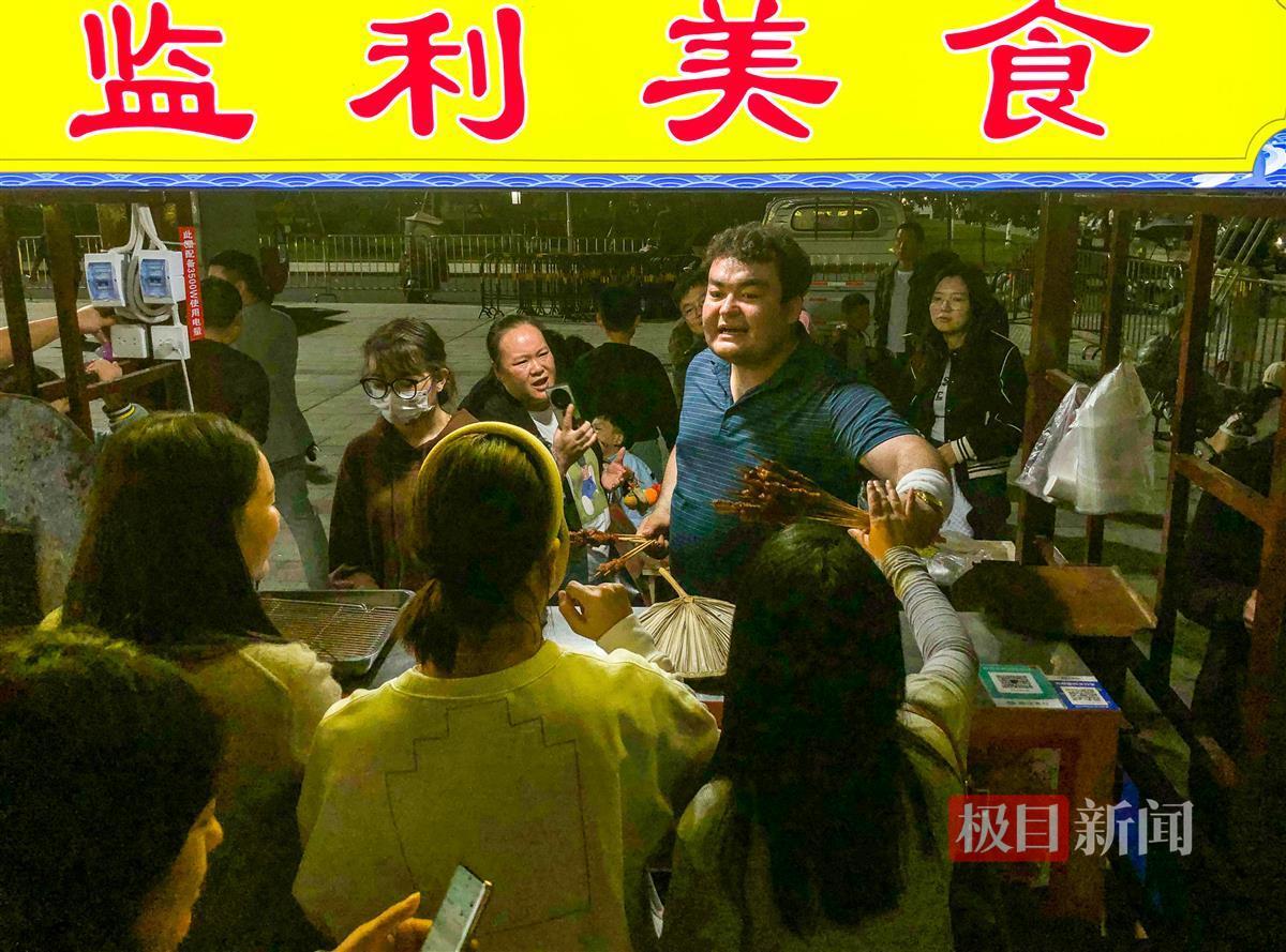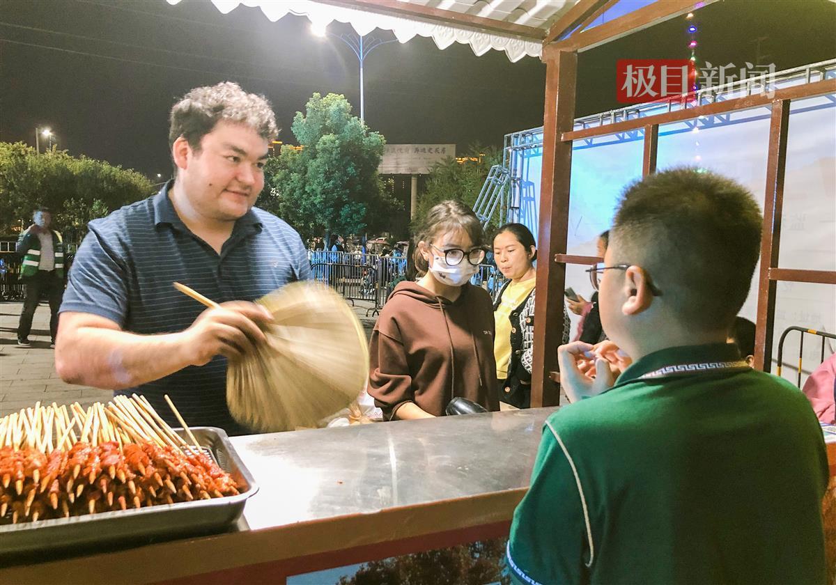 美食节现场,人气最旺的摊位,非玉苏普江的烧烤摊莫属。极目新闻记者现场看到,从傍晚开摊到临近收摊,玉苏普江和妻子夏尔班几乎就忙得没有停歇。