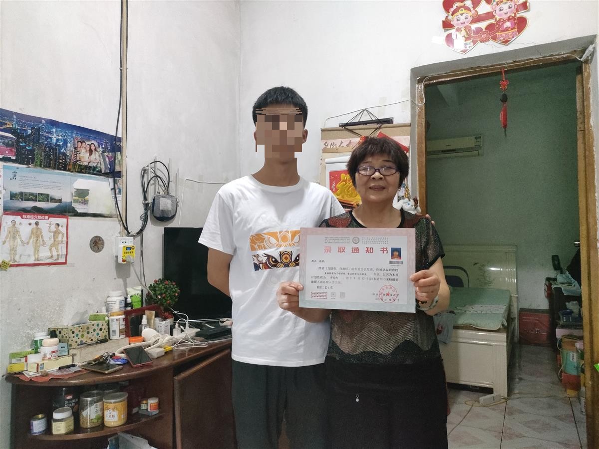 小杰考上大学,刘芳拿着录取通知书和孙子合影(通讯员供图)