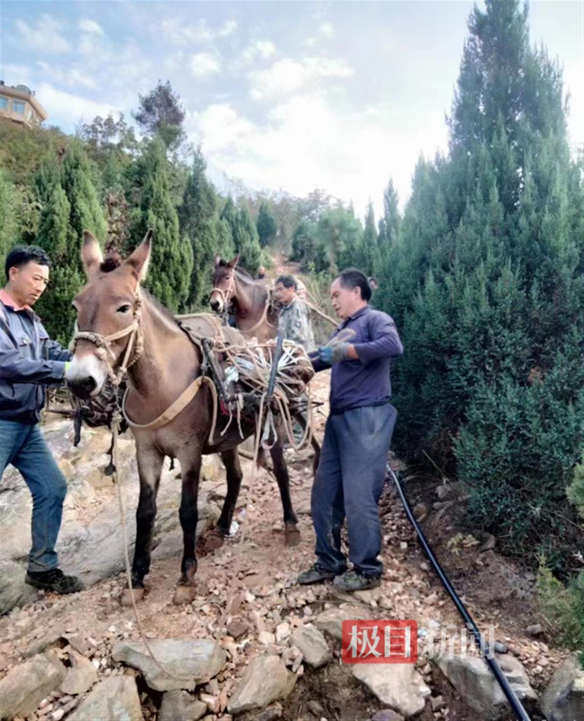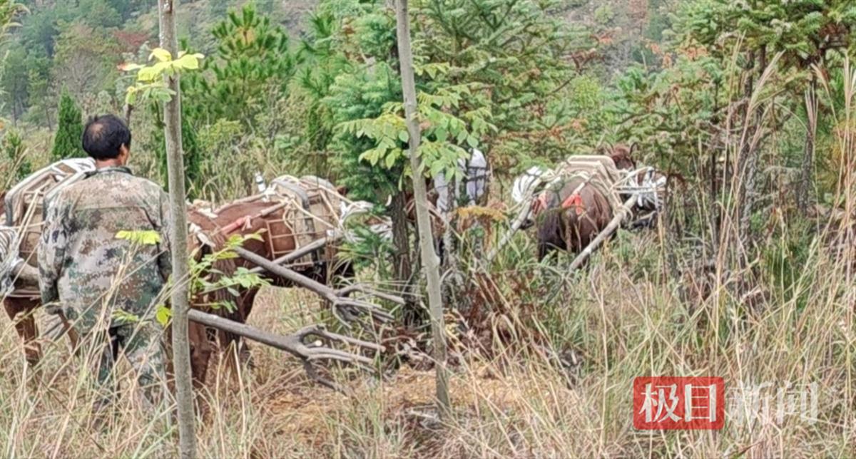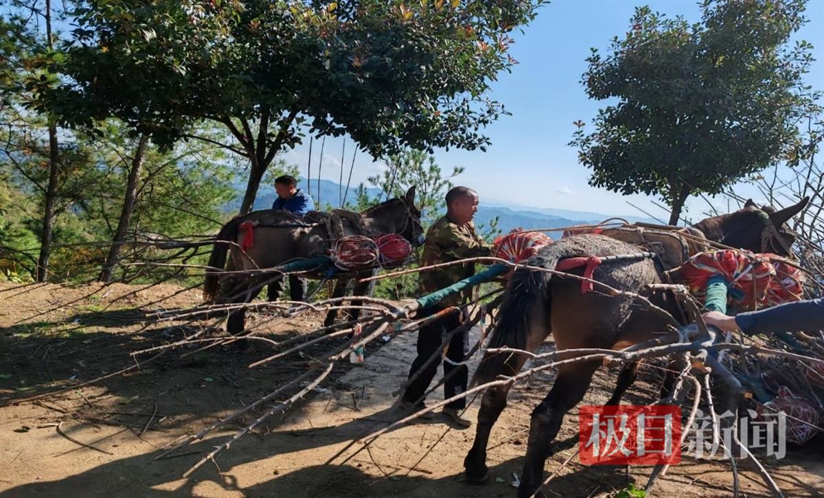 大尖山山路崎岖,土质贫瘠,施工点地势高、山体坡度大,车辆难以通行,大型机械无法运输进来,只能采用最传统最适合林间运输的方式——骡队,将种植所需的苗木等物资从山下运输到施工点。