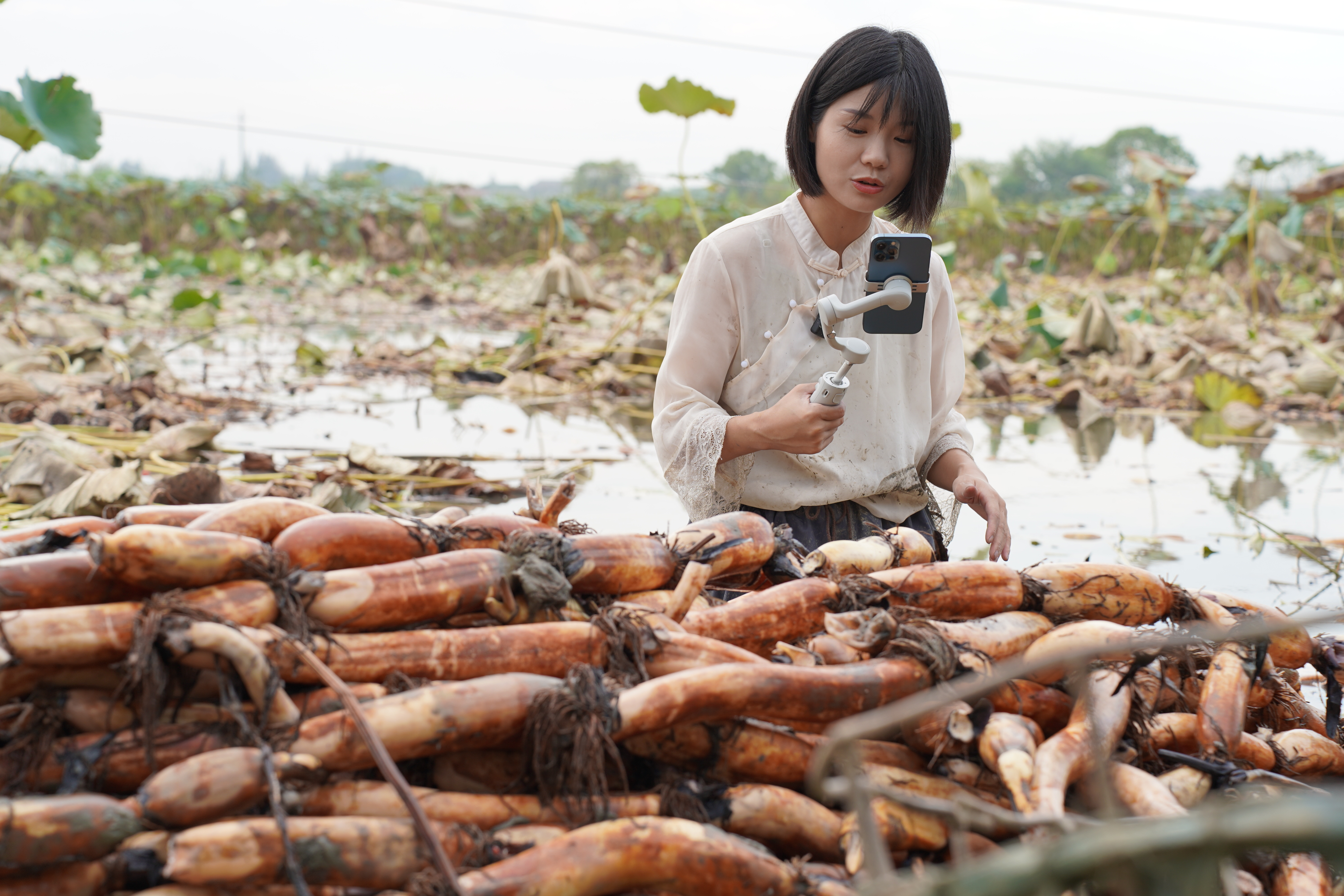 10月下旬,正是洪湖莲藕大量上市的时候,万顷碧波,千株香荷,放眼望去,随处可见藕农们采挖莲藕。赵聪的直播间里也热闹非凡,购买莲藕的订单络绎不绝。